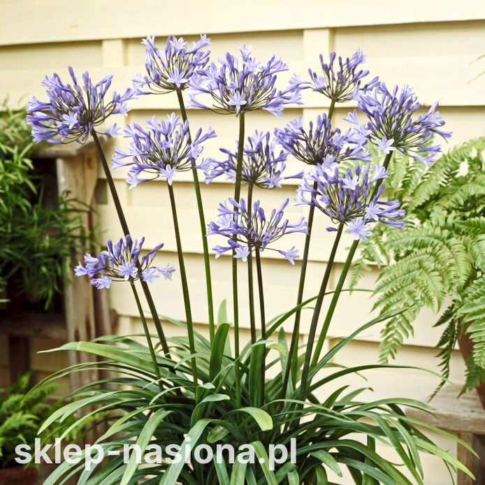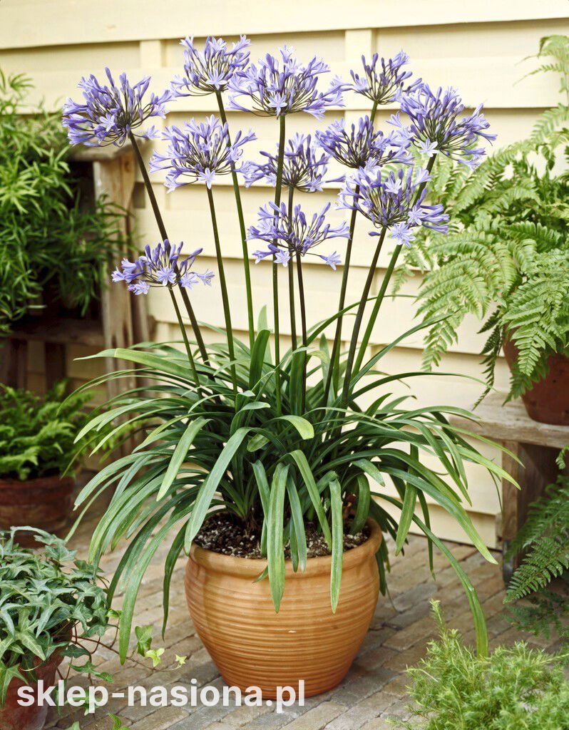 Agapant Dr Brouwer jest kłączową byliną o długich wąskich liściach i baldachu niebieskich kwiatów, osadzonych na wysokim pędzie. Kwitnienie tej zjawiskowej rośliny zaczyna się późną wiosną. Pokrój agapantu, gwarantuje mu ciekawy wygląd, nawet jak nie ma na nim kwiatów. Kępa trawiastych, mięsistych liści o soczystej, błyszczącej zieleni pięknie wygląda w ogrodowych donicach i skrzyniach. Kwiatostan złożony z dzwonkowatych kwiatów o niebieskiej barwie wyróżnia się wśród rodzimych kwiatów niespotykanym urokiem. Pojemniki z agapantem to fenomenalna dekoracja strefy wejściowej domu, idealnie pasują na taras i balkon. Roślina jest urzekająca pod ścianą altanki, czy w kąciku wypoczynkowym. Kwiaty Agapantu nadają się do cięcia i układania w eleganckie bukiety. Niebieski kwiatostan jest atrakcyjny dla owadów, które chętnie go odwiedzają.