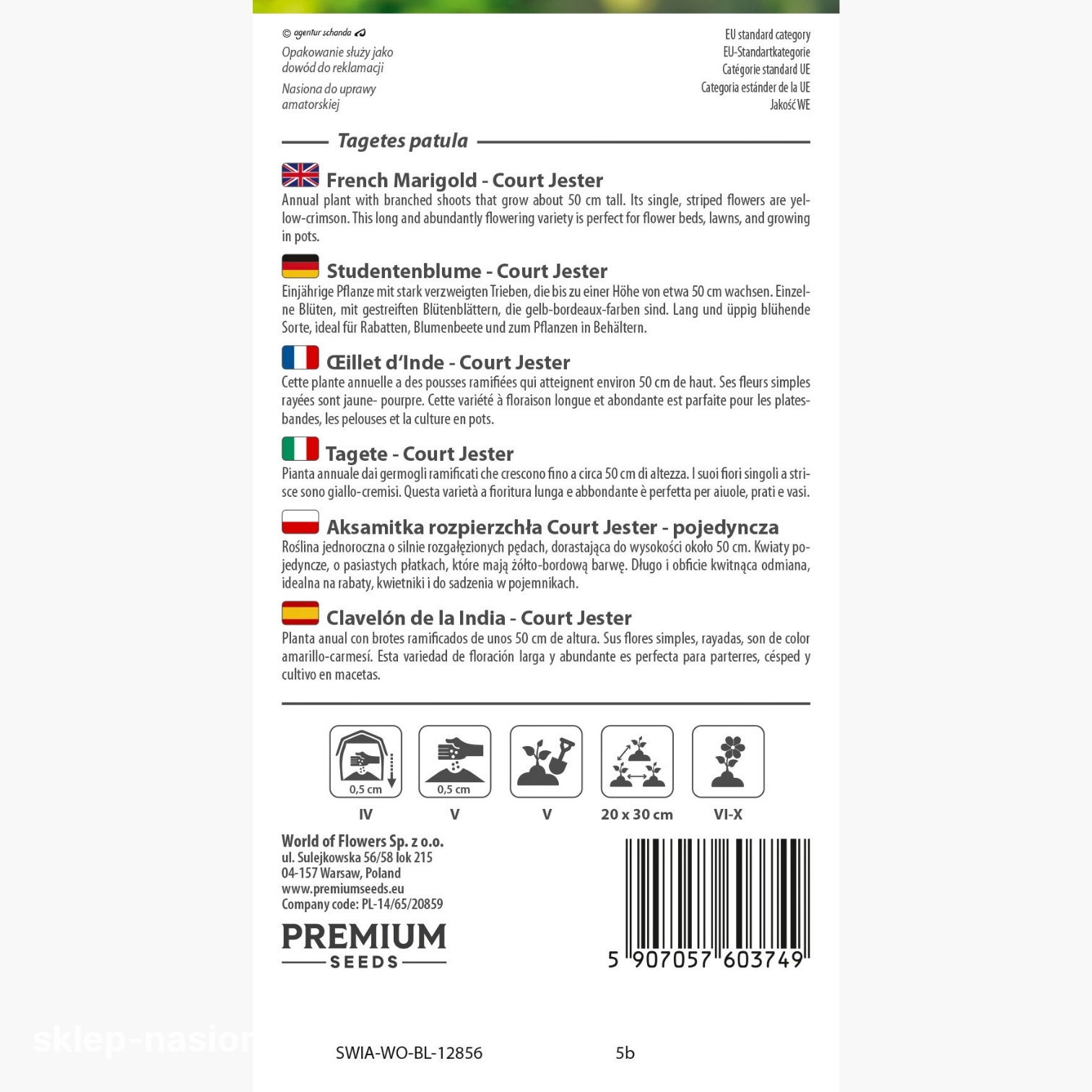W opakowaniu znajduje się 1 g nasion Aksamitki rozpierzchłej Court Jester - pojedynczej. Każda paczka zawiera termin przydatności do siewu oraz praktyczne wskazówki dotyczące uprawy.