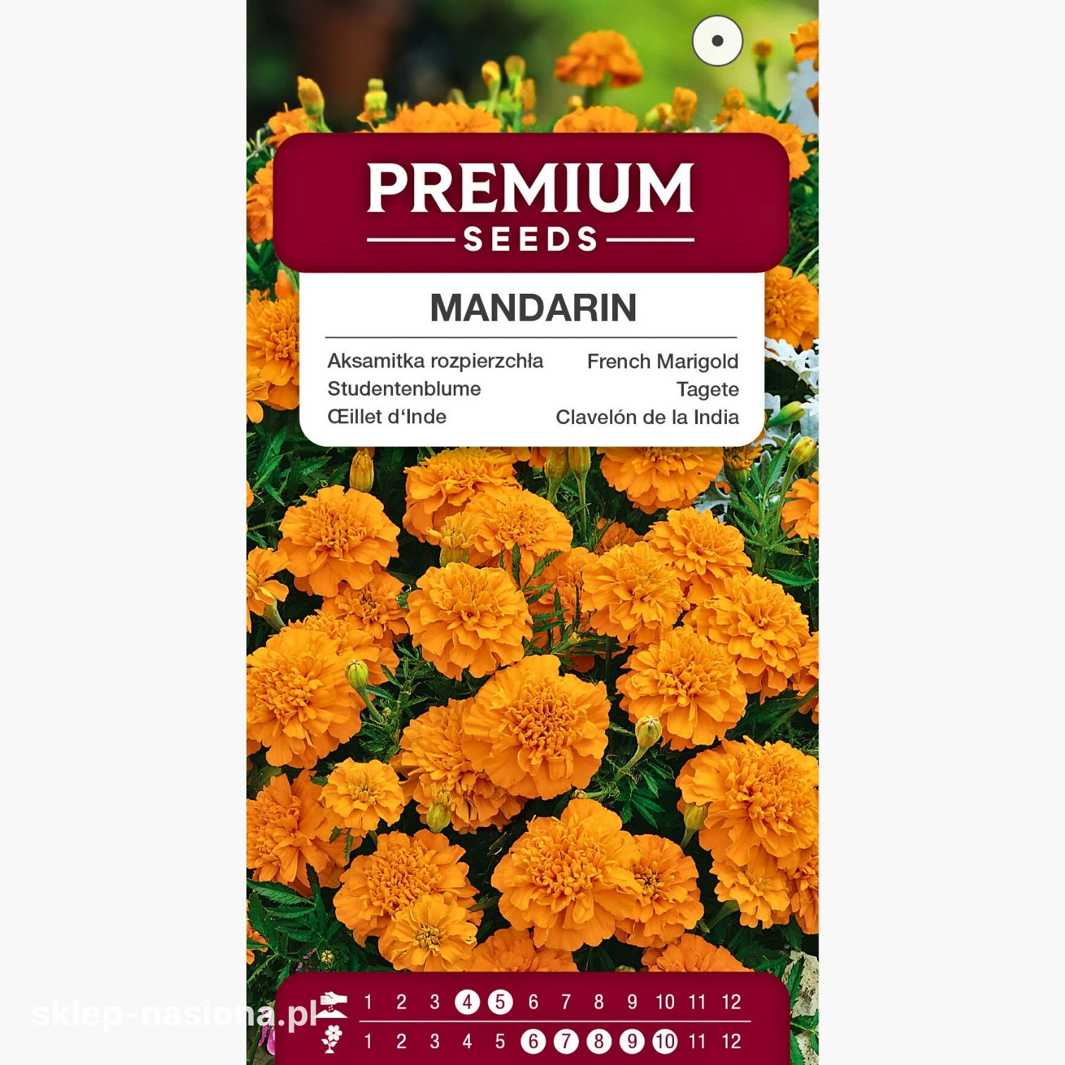 Opakowanie zawiera 0,5 g nasion aksamitki rozpierzchłej Mandarin, informacje na temat daty przydatności nasion do siewu i zasady uprawy.