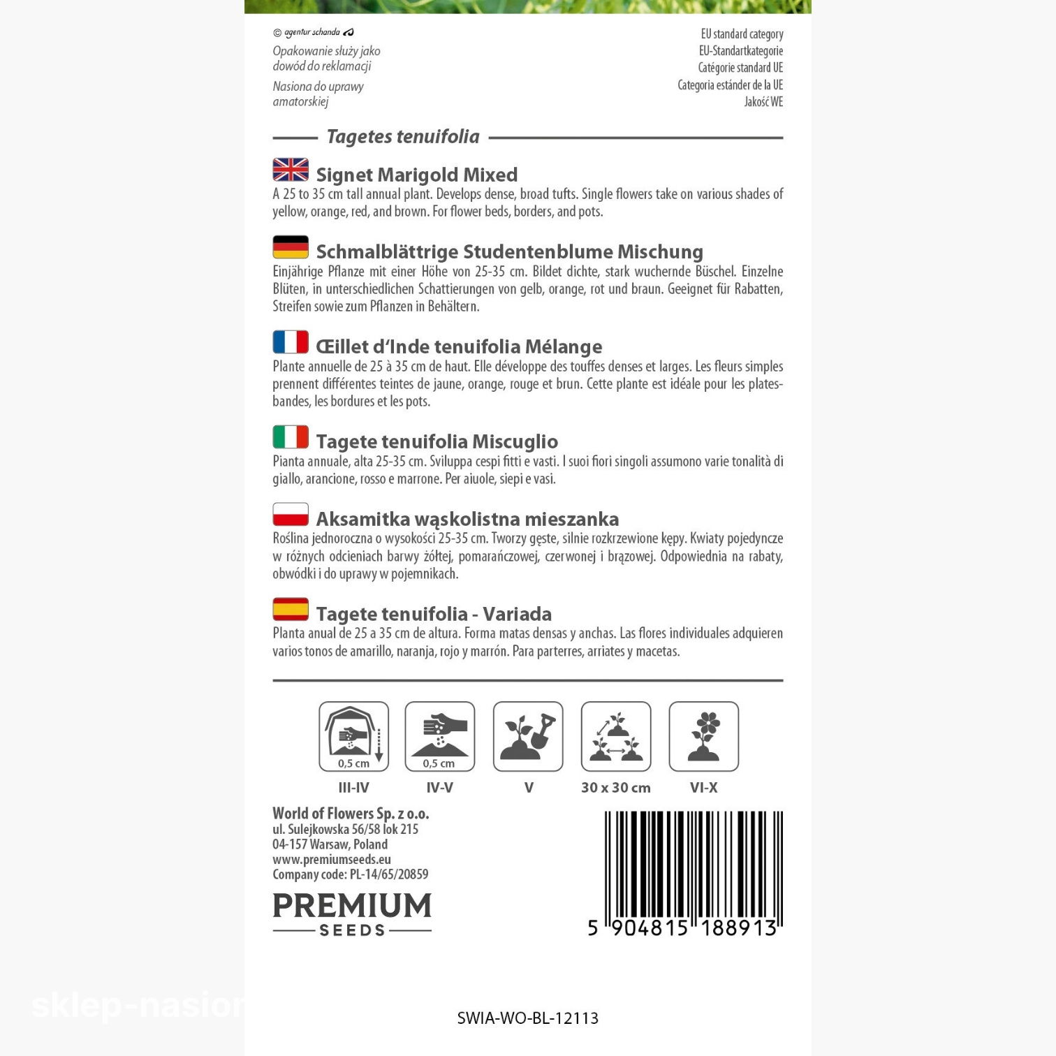 Oferowane przez sklep opakowanie zawiera 0,5g nasion oraz informacje o terminie przydatności do siewu i ogólnych zasadach uprawy.