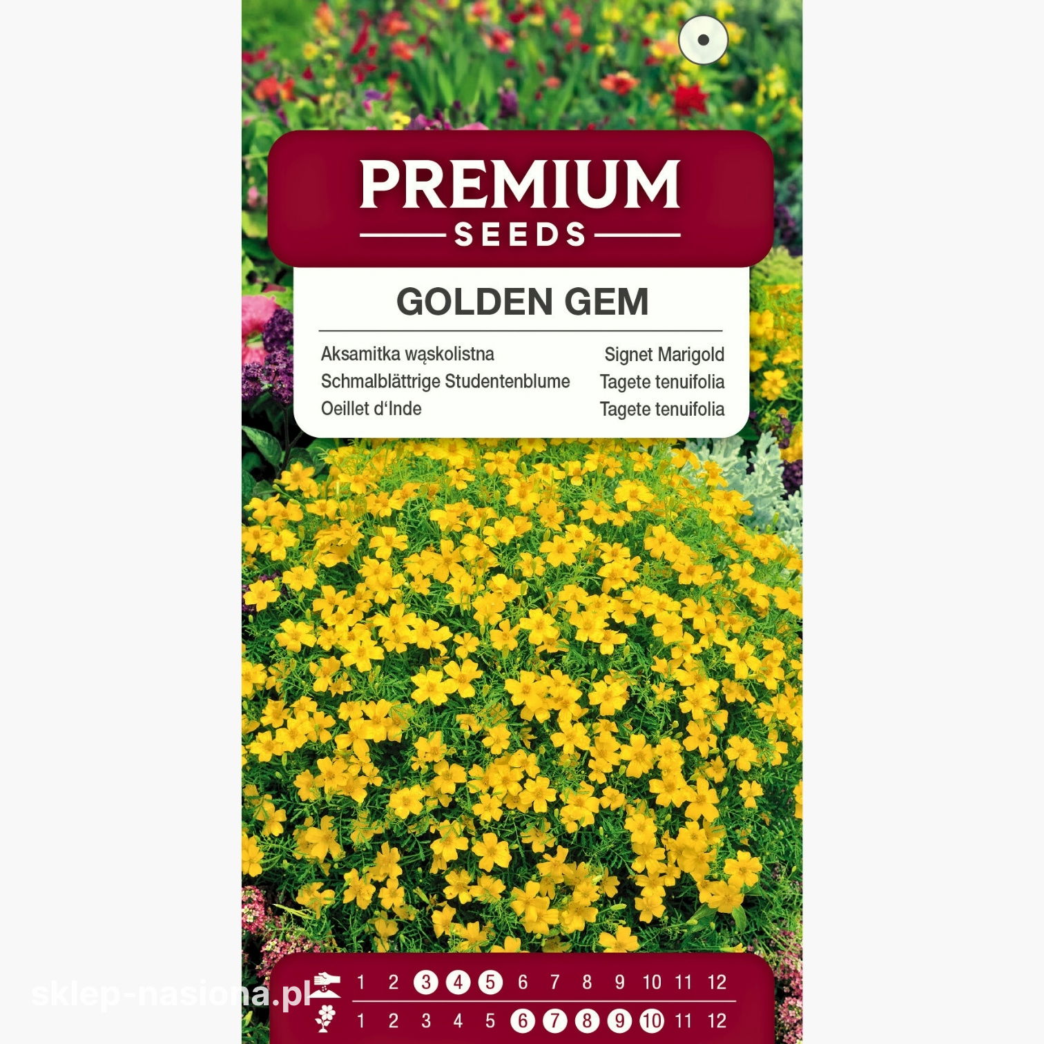 Nasz sklep prowadzi sprzedaż nasion aksamitki wąskolistnej złotożółtej w opakowaniach o gramaturze 0,5 g. Każde opakowanie zawiera informacje o terminie przydatności do siewu i ogólnych zasadach uprawy.
