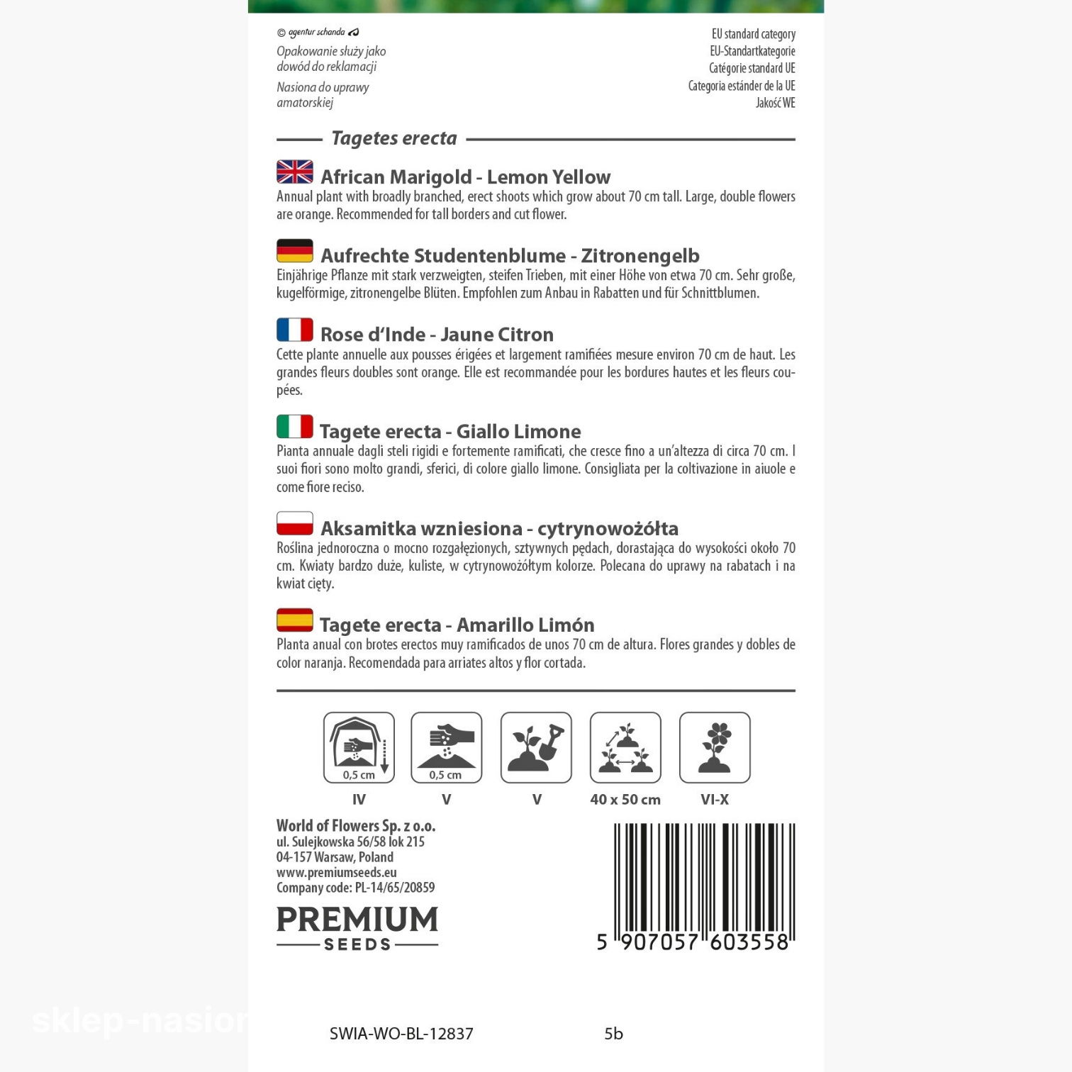 Kolor kwiatów: Kwiaty aksamitki wzniesionej, której nasiona ma w sprzedaży nasz sklep, mają cytrynowożółty kolor.