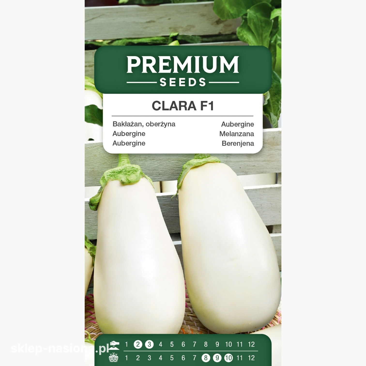 W opakowaniu znajduje się 0,5 g nasion bakłażana Clara F1. Każde opakowanie zawiera termin przydatności do siewu oraz szczegółowe wskazówki uprawowe.