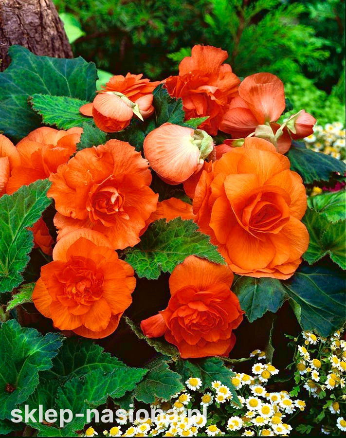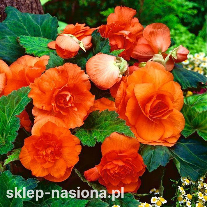 Różane kwiaty łatwej w uprawie begonii podwójnej ocieplą wygląd zacienionego zakątka ogrodu. Te niewielkie rośliny formują urocze krzaczki, obsypane okazałymi kwiatami przez całe lato i część jesieni. Żywa, jaskrawa barwa płatków odmiany pomarańczowej, oferowanej w naszym sklepie, nadaje jej wyjątkowe walory dekoracyjne.