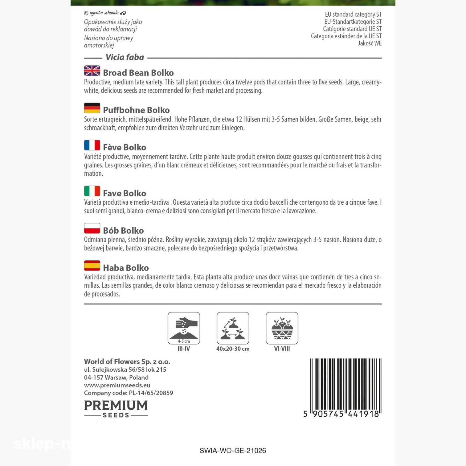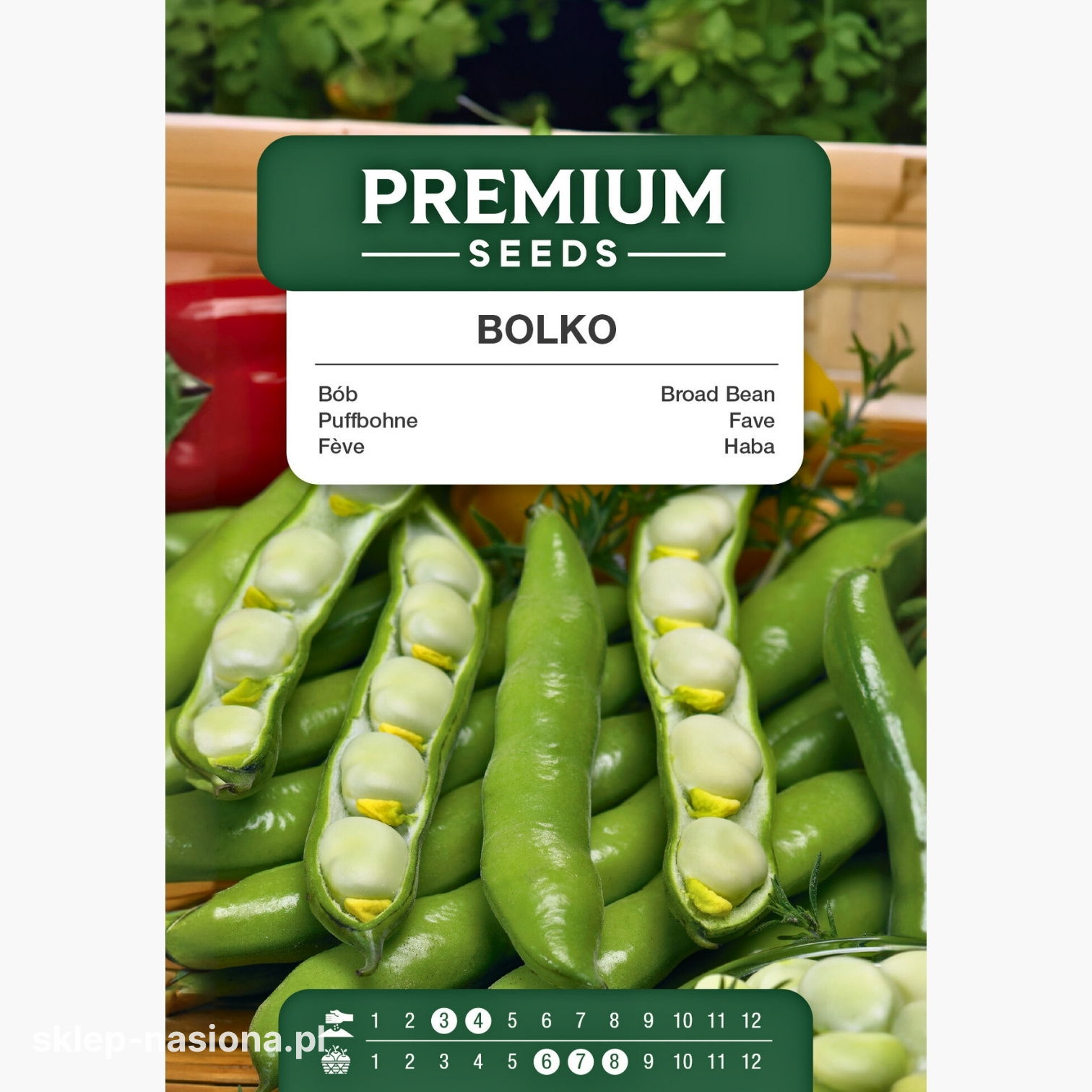 Opakowanie zawiera 40 gramów nasion bobu - Bolko. Na odwrocie opakowania znajdują się informacje o roślinie i jej uprawie.