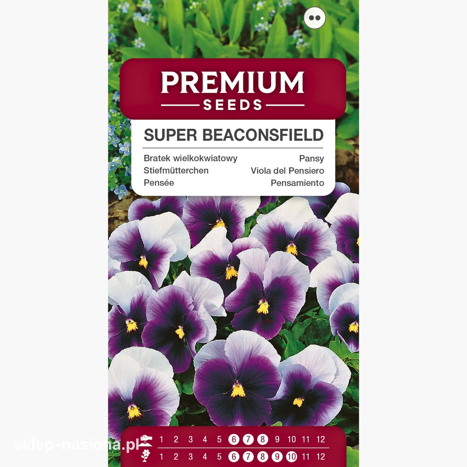 W opakowaniu znajduje się 0,5 g nasion bratka wielkokwiatowego Super Beaconsfield, z wyraźnie oznaczoną datą przydatności oraz praktyczną instrukcją siewu.