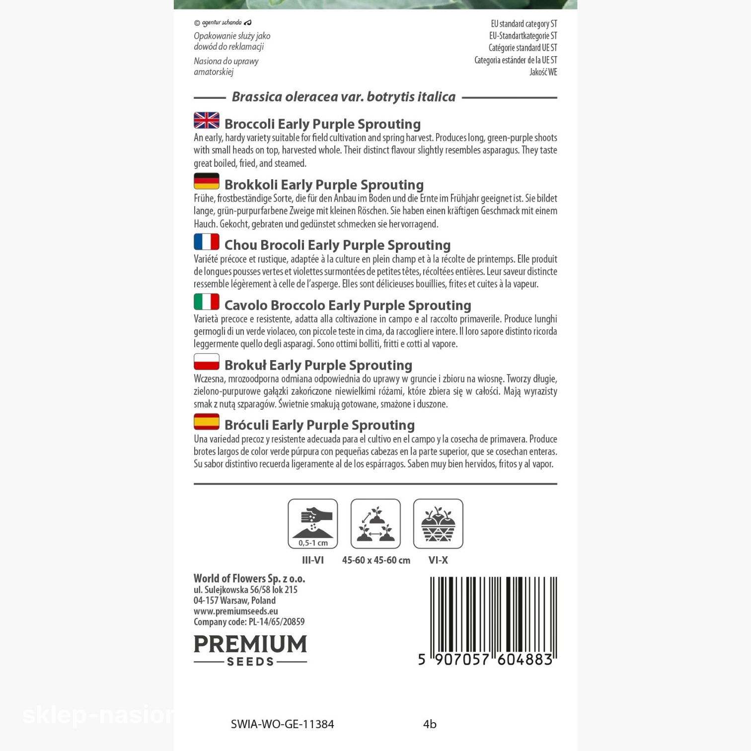 Brokuł Early Purple Sprouting to ciekawa odmiana brokułu gałązkowego, tworząca różyczki w intensywnym fioletowym kolorze, które wyrastają na szczytach licznych, fioletowo nabiegłych, jadalnych gałązek. Różyczki i gałązki tej odmiany brokułu cechują się wyrazistym aromatem z delikatną nutą szparagów i mogą być spożywane na wiele różnych sposobów.