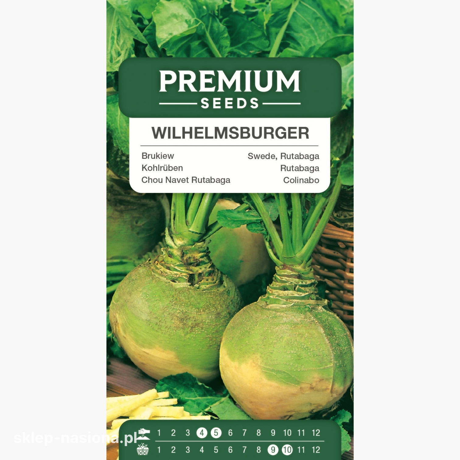 W opakowaniu znajduje się 10 g nasion brukwi Wilhelmsburger. Każde opakowanie zawiera informacje o terminie przydatności do siewu oraz ogólne wskazówki dotyczące uprawy.