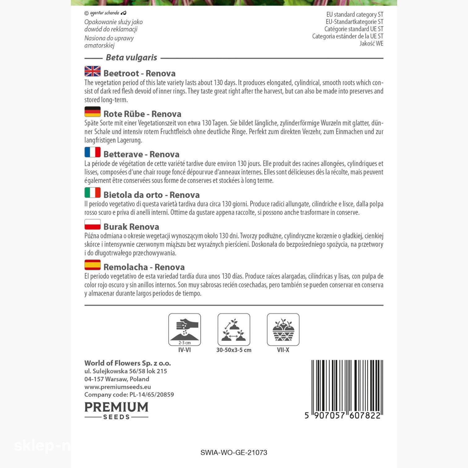 W opakowaniu znajduje się 10 g nasion buraka ćwikłowego Renova. Każde opakowanie zawiera informacje o terminie przydatności do siewu oraz ogólne wskazówki dotyczące uprawy.