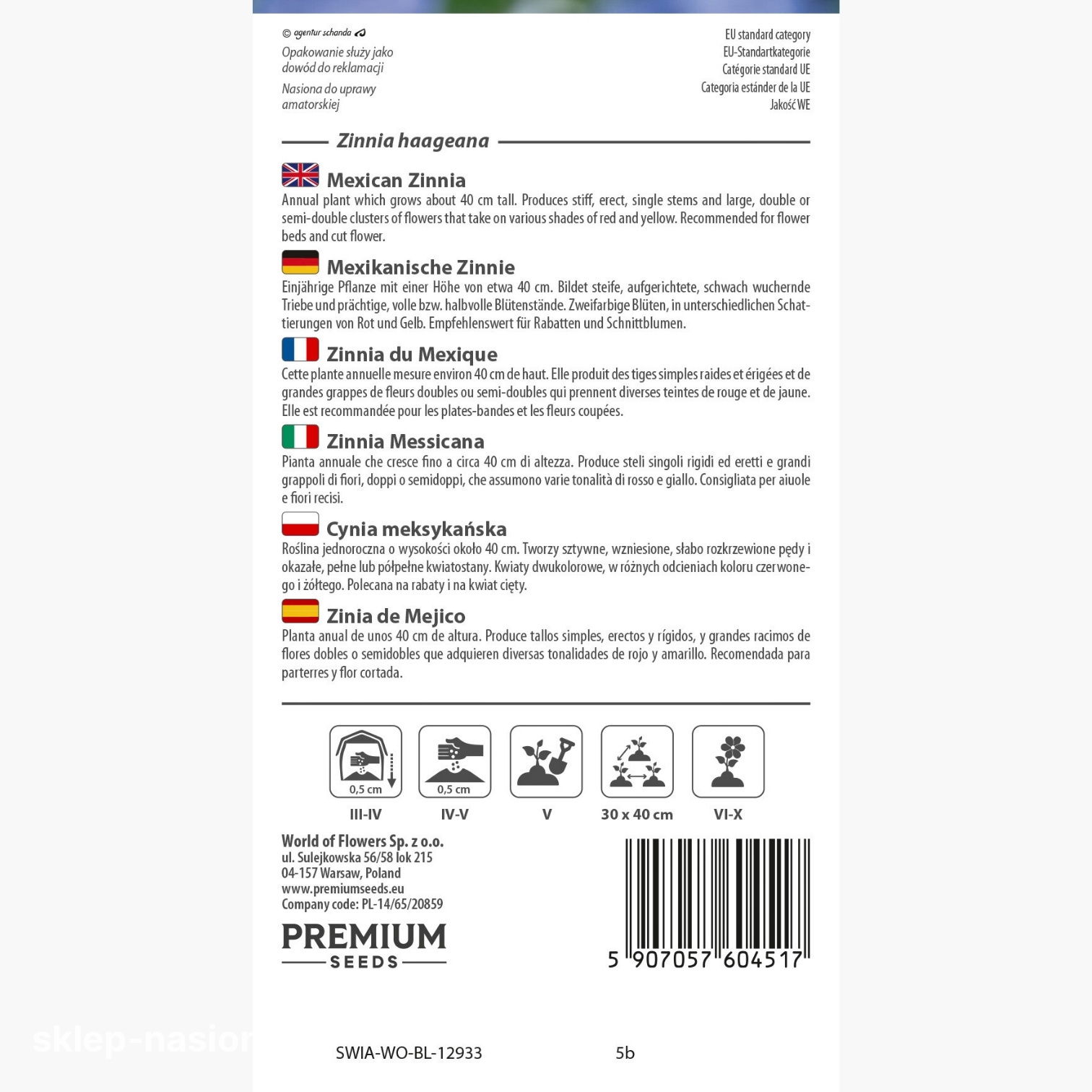 W każdym opakowaniu znajdują się 0,5 g nasion. Na torebce zamieszczono informacje dotyczące sposobu uprawy cynii i wskazówki na temat terminu przydatności jej nasion do siewu.