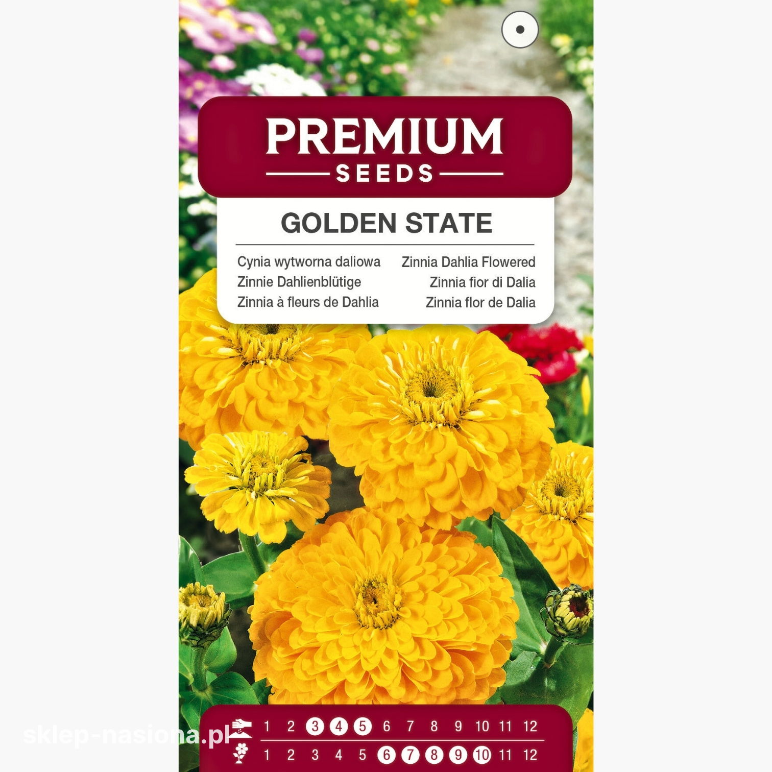 W opakowaniu znajduje się 1 gram nasion Cynii wytwornej daliowej Golden State. Każde opakowanie zawiera szczegółowe informacje o terminie przydatności do siewu oraz praktyczne wskazówki dotyczące uprawy.