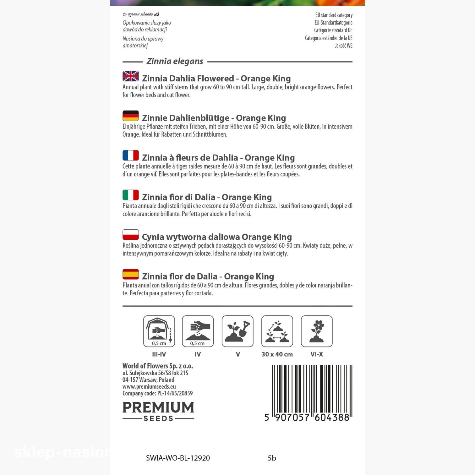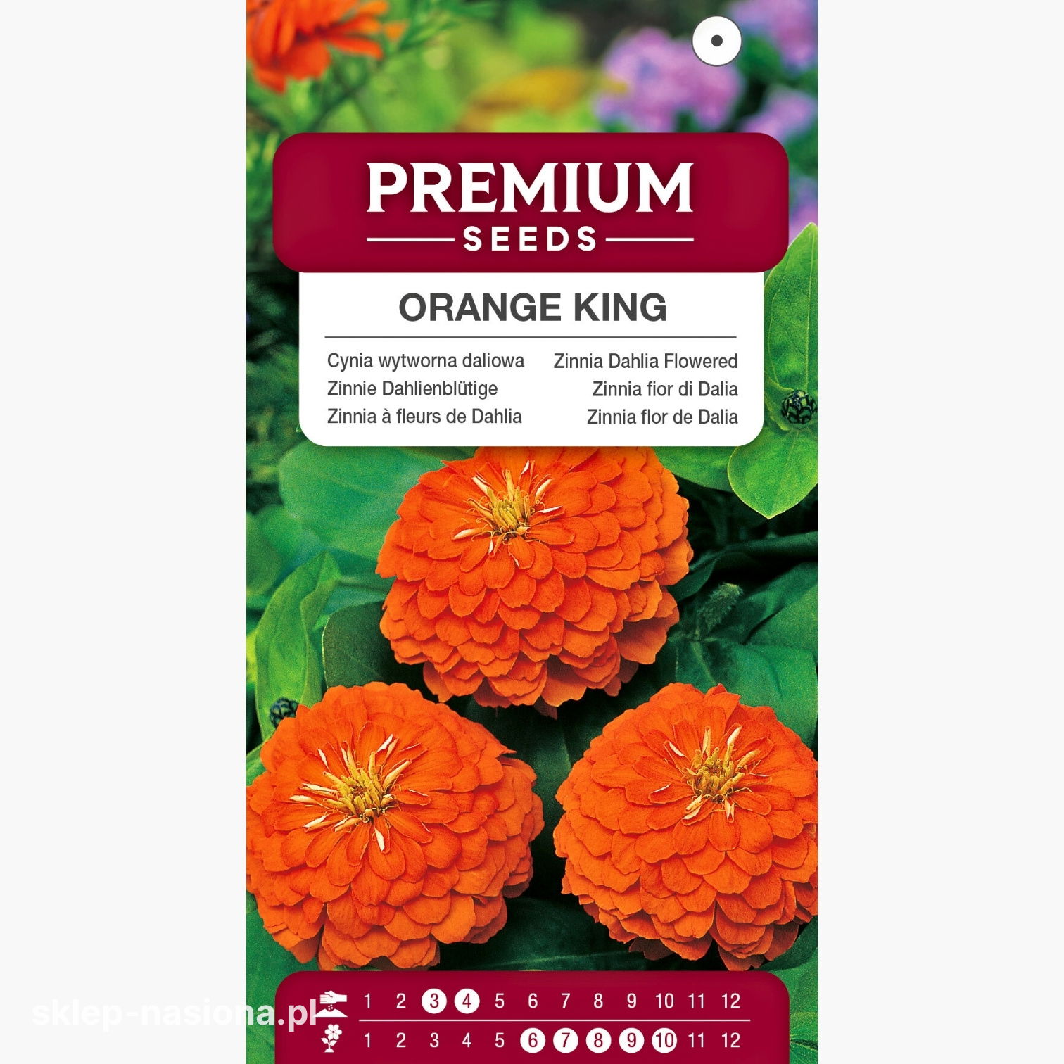Opakowanie zawiera 1 g nasion cynii wytwornej daliowej Orange King. Na odwrocie torebki znajdują się data przydatności nasion do siewu i zalecenia dotyczące uprawy roślin.