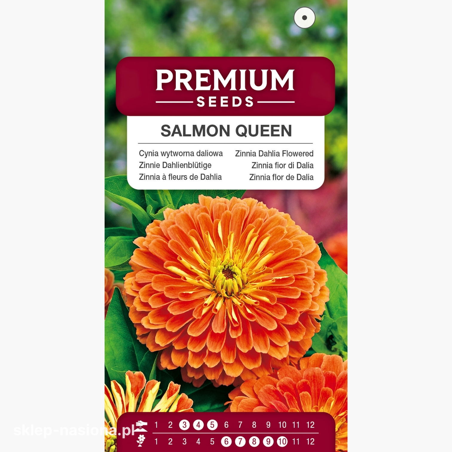 W opakowaniu znajduje się 1 g nasion Cynii wytwornej daliowej Salmon Queen. Każde opakowanie zawiera informacje o terminie przydatności do siewu oraz ogólne wskazówki dotyczące uprawy.