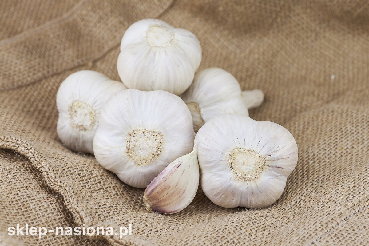 Główka: Prezentowana w naszym sklepie odmiana rodzi wyjątkowo duże, kształtne główki o masie do 100 g. Są one okryte dobrze przylegającą, mocną białą łuską. Pod nią kryje się 4-8 dorodnych ząbków w kolorze białym. Każdy ząbek jest osłonięty cienką, żyłkowaną łuską, łatwą do obrania.