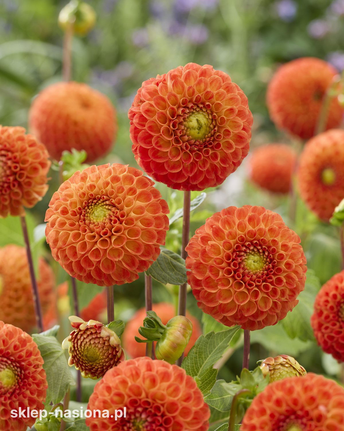 Rodzaj i kolor kwiatów: Pomponowe, kuliste kwiaty o średnicy 5–7 cm – intensywnie pomarańczowe, z gęsto ułożonymi płatkami tworzącymi regularną formę.