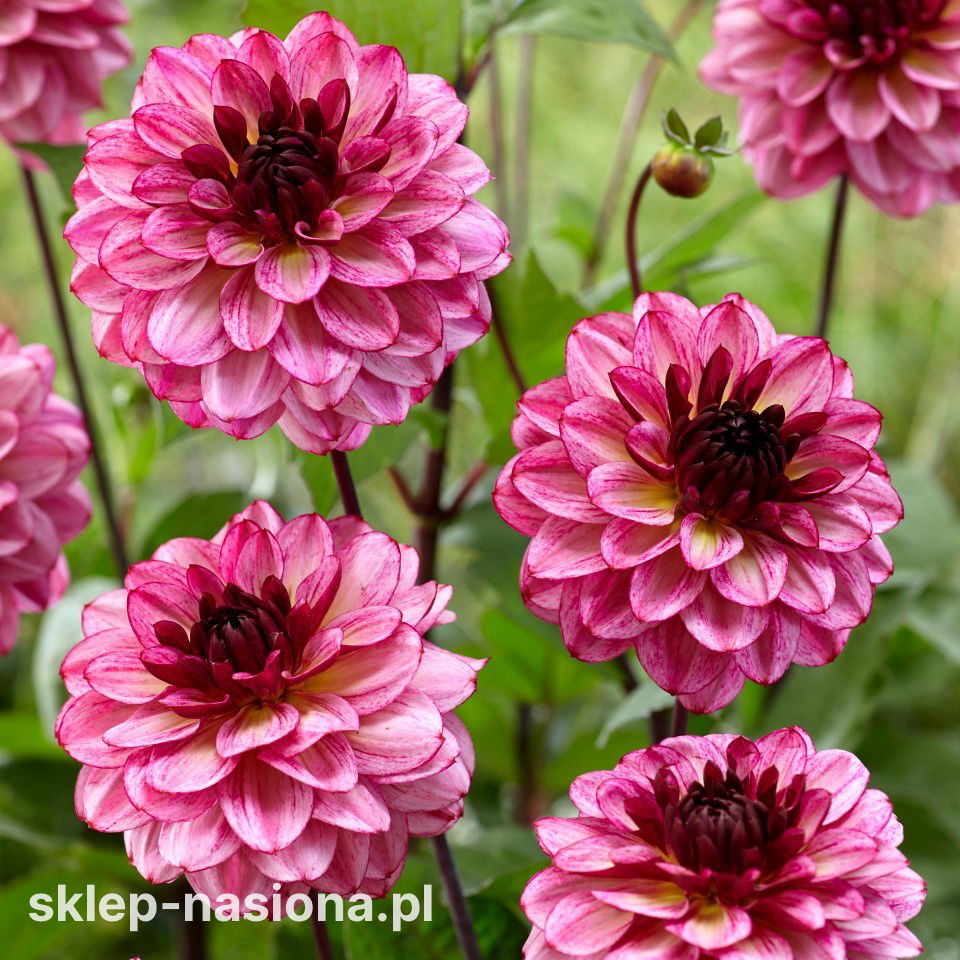 Dalia 'Muchacha' to wielobarwna odmiana dekoracyjna, która zwraca uwagę efektownym układem kolorów oraz regularnym, zwartym pokrojem. Dzięki połączeniu pudrowego różu, kremowej bieli i delikatnej żółci stanowi oryginalny akcent w ogrodowych kompozycjach – świetnie sprawdza się zarówno na rabatach, jak i w donicach tarasowych. Jej kwiaty mają duże walory ozdobne i długo zachowują świeżość po ścięciu, co czyni ją również dobrym wyborem do bukietów.