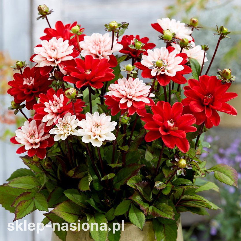 Dalia ‘Pacific Time’ to odmiana, która wnosi do ogrodu wyrazisty, energetyczny akcent dzięki swoim pełnym, biało-czerwonym kwiatom. Ich dynamiczny kontrast kolorystyczny przyciąga uwagę, a roślina doskonale sprawdza się zarówno na rabatach, jak i w donicach czy bukietach, oferując długie i niezawodne kwitnienie.