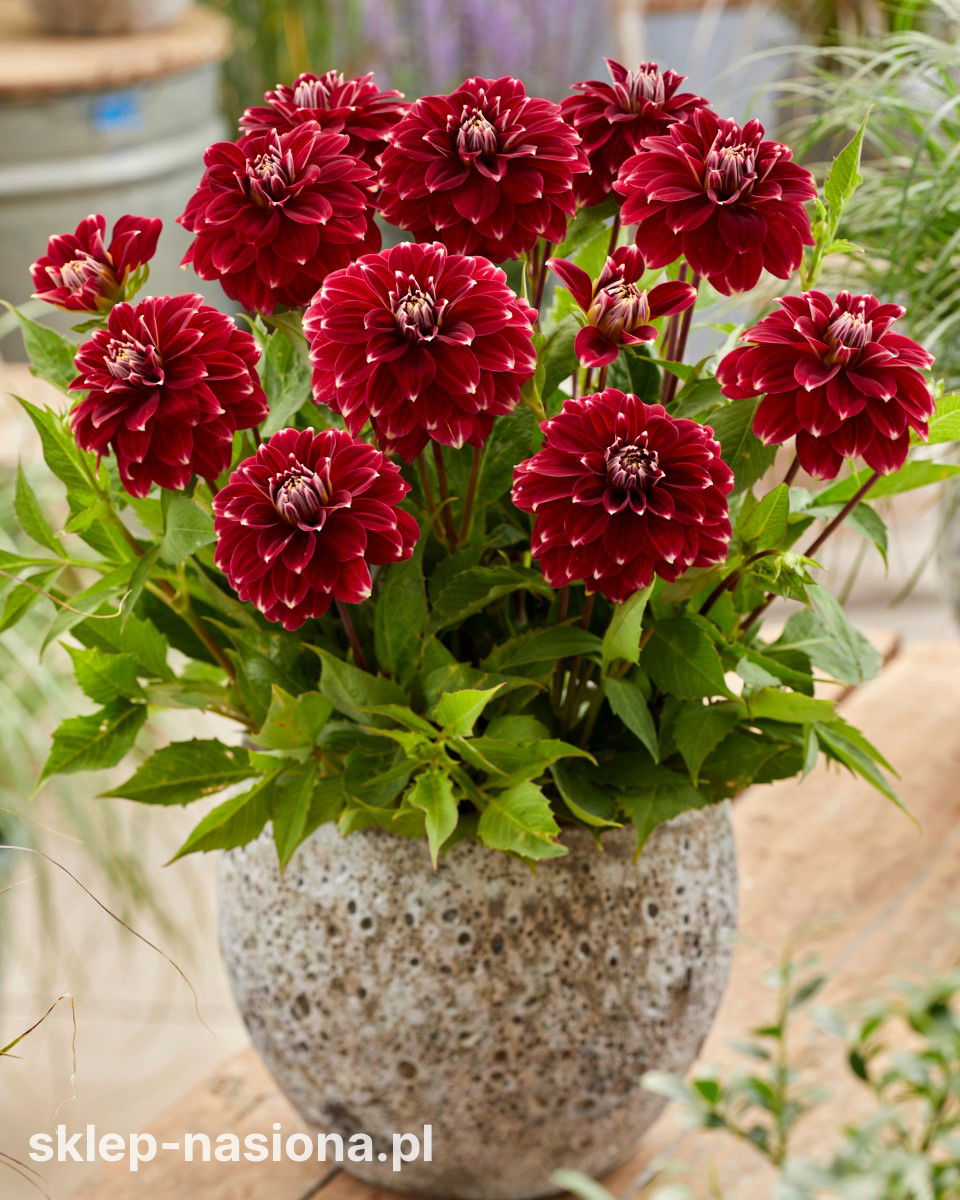 Dalia ‘Red Rock’ to wyrazista odmiana, która przyciąga wzrok dwukolorowymi kwiatami w intensywnej czerwieni z białymi końcówkami płatków. Jej kontrastowe ubarwienie nadaje rabatom dynamiki, a cała roślina emanuje klasyczną elegancją z nowoczesnym akcentem.