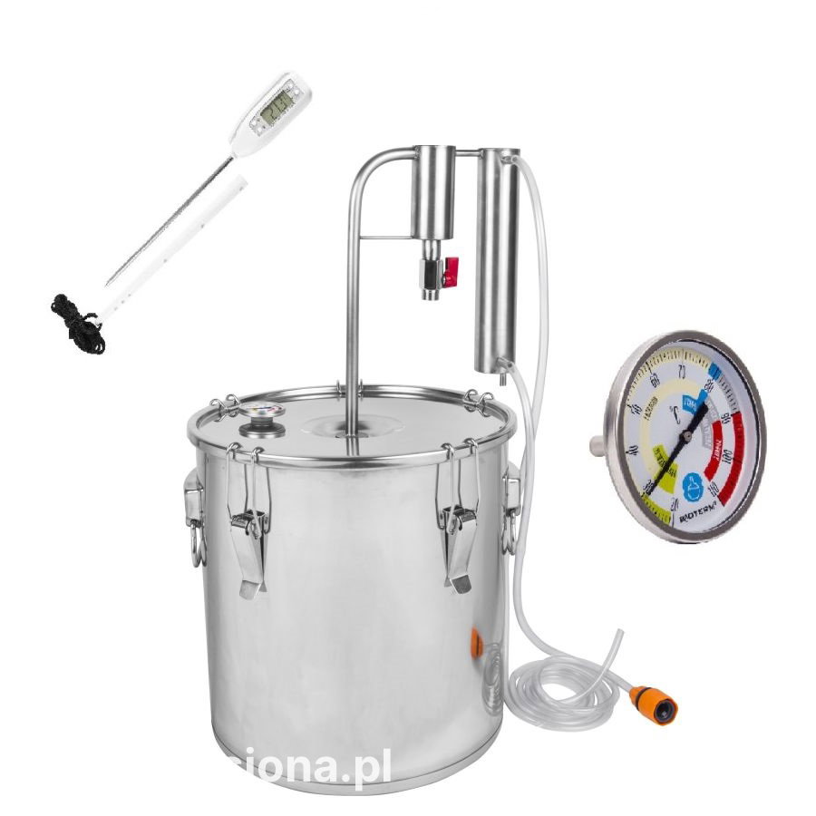 Destylator ze stali nierdzewnej pozwala na produkcję wysokiej jakości trunków. Posłuży również do destylowania wody i innych związków chemicznych. Zestaw gwarantuje czystą destylacje i szybkie gotowanie. W domowych warunkach stworzysz wysokoprocentowy trunek, wyróżniający się wybornym smakiem i zapachem. Doskonale dostosowany do użytku domowego, jest łatwy w obsłudze i całkowicie bezpieczny w stosowaniu.