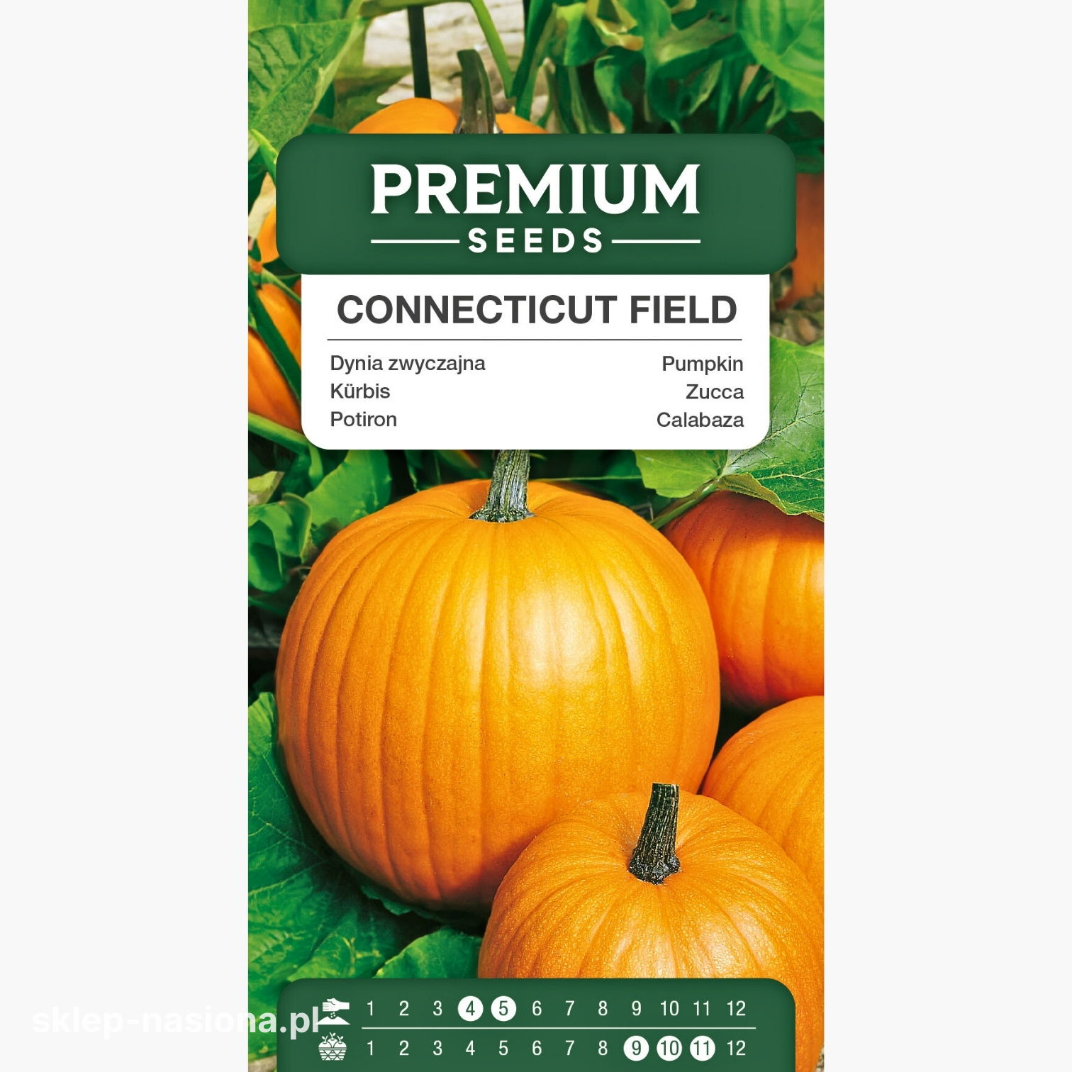 W opakowaniu znajduje się 3 g nasion dyni Connecticut Field. Każde opakowanie zawiera informacje o terminie przydatności do siewu oraz ogólne zalecenia dotyczące uprawy.
