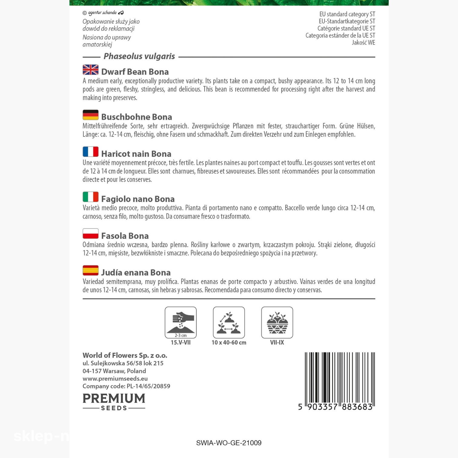 W opakowaniu znajduje się 30 g nasion fasoli Bona. Opakowanie zawiera wskazówki na temat siewu oraz termin przydatności nasion do uprawy.