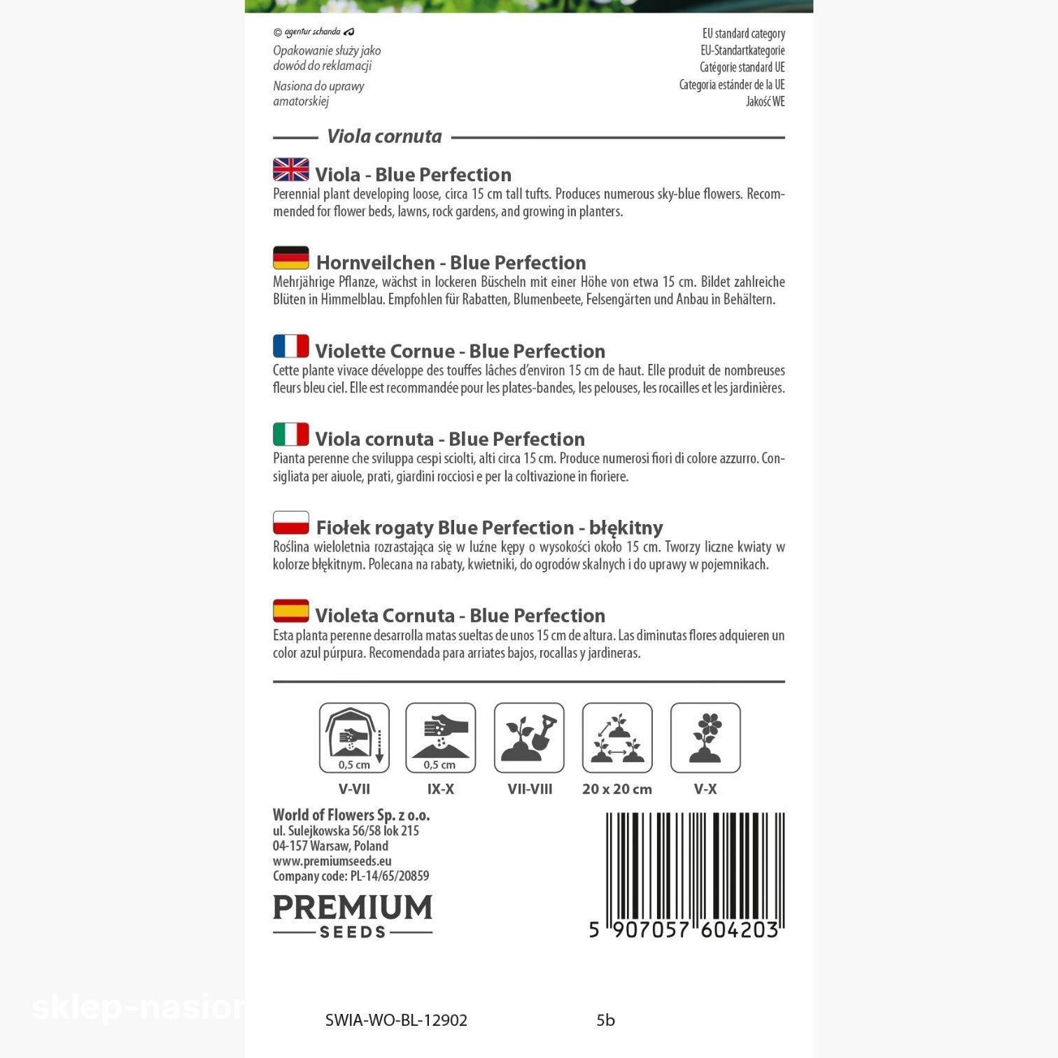 W opakowaniu znajduje się 0,3 g nasion fiołka rogatego Blue Perfection. Każde opakowanie zawiera informacje o terminie przydatności do siewu oraz praktyczne wskazówki dotyczące uprawy.