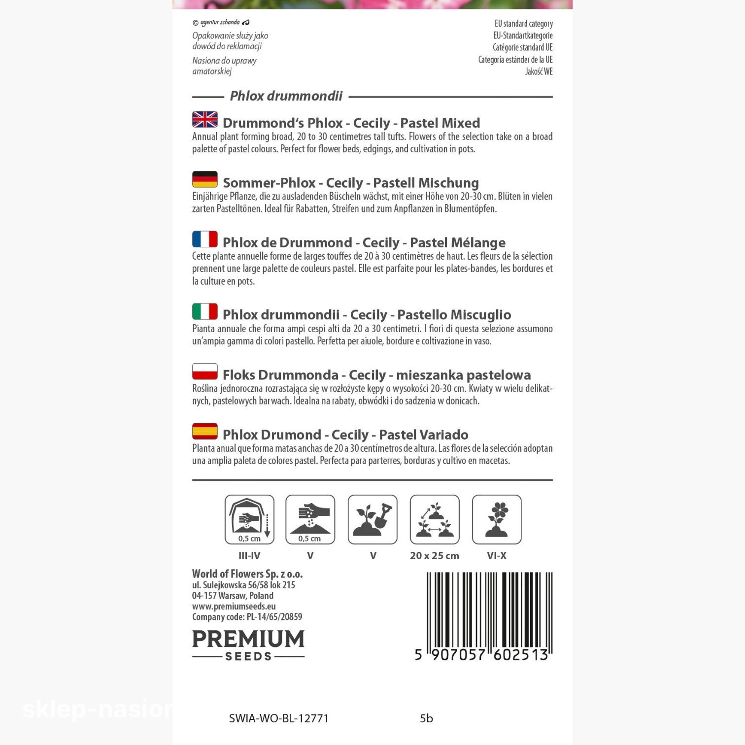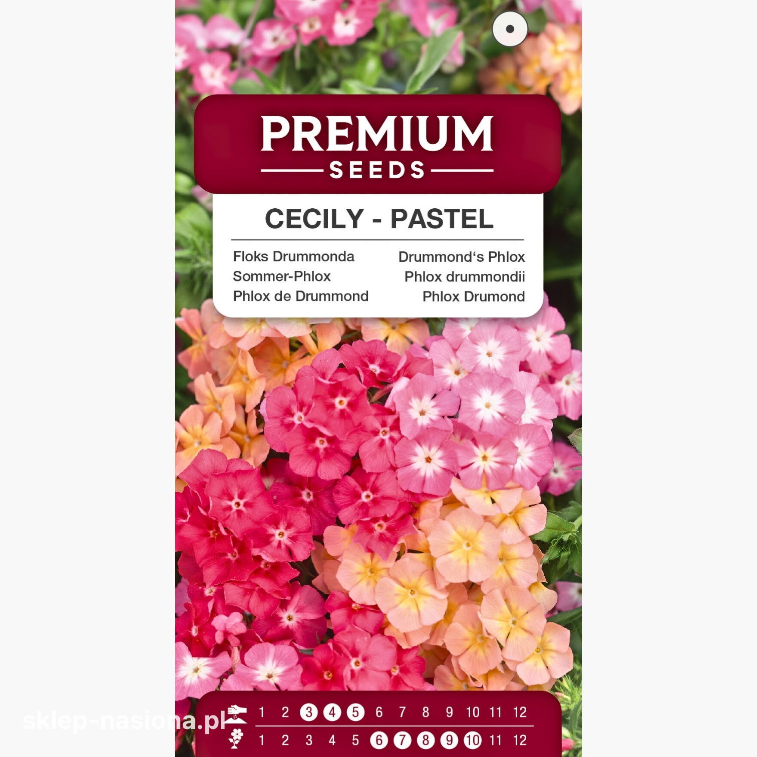 W opakowaniu znajduje się 1 g nasion Floksa Drummonda Cecily - mieszanki pastelowej. Każde opakowanie zawiera aktualną datę przydatności do siewu oraz praktyczne wskazówki dotyczące uprawy.