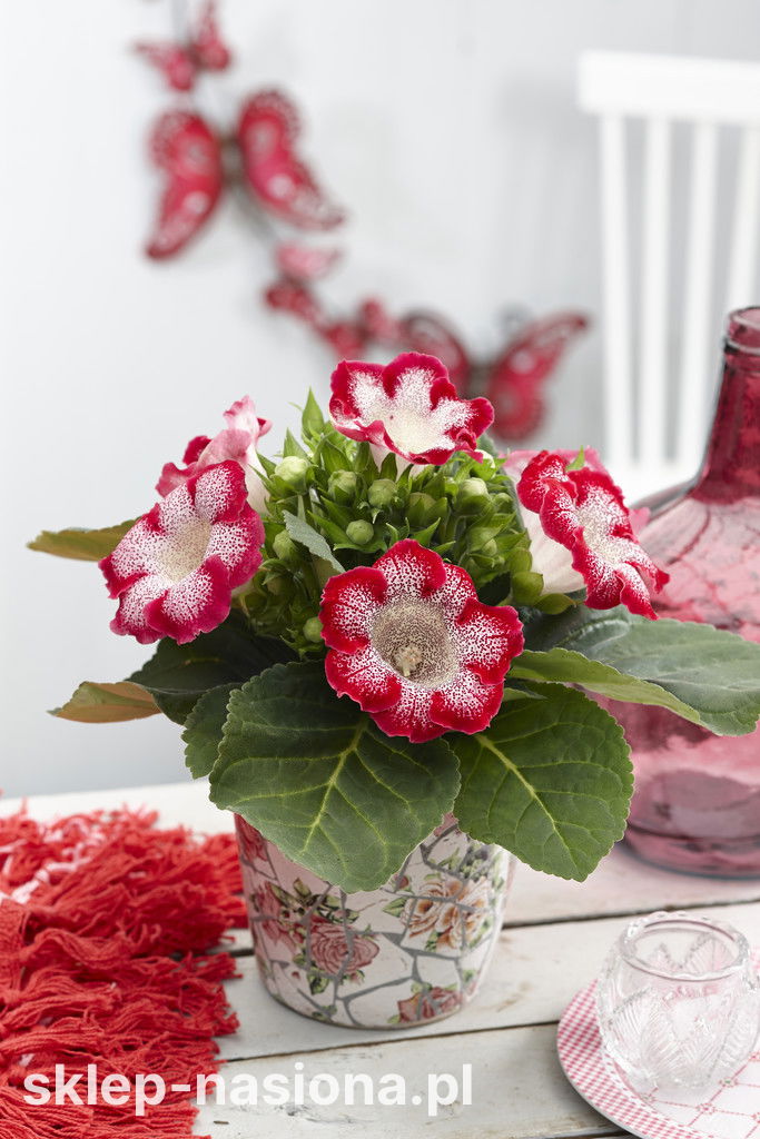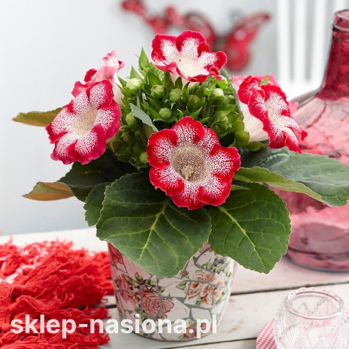 Gloksynia 'Tigrinia Red' to odmiana, która z łatwością przykuwa uwagę swoimi efektownymi, nakrapianymi kwiatami o biało-czerwonej barwie. Jest to roślina niezbyt okazała, ale jej urok tkwi w detalu i intensywności kolorów kwiatów, które pięknie kontrastują z zielonymi liśćmi. Dzięki swojej zwartości oraz obfitemu i długotrwałemu kwitnieniu, odmiana ta jest idealnym wyborem do wnętrz, ogrodów zimowych, a także jako dekoracja balkonów czy tarasów w cieplejszych miesiącach.