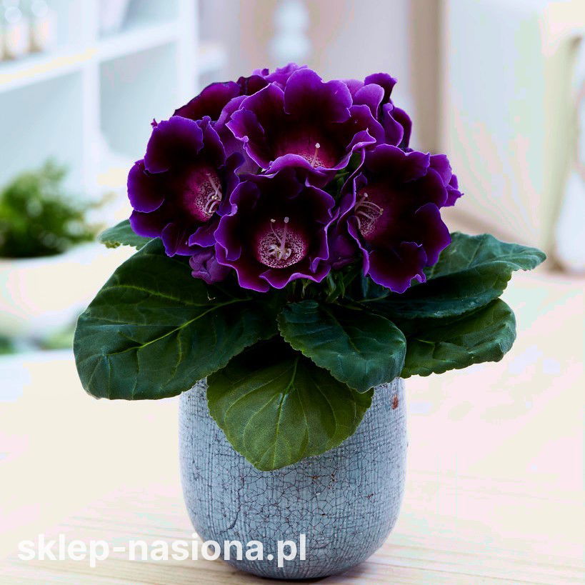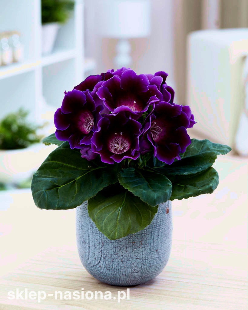 Gloksynia, bardziej znana jako syningia, to urocza roślina ozdobna, której popularność wynika z oryginalnych kwiatów. Prezentowana przez nasz sklep odmiana Hollywood kwitnie na ciemnofioletowy, niemal czarny kolor, który może wydawać się dość problematyczny. Nic bardziej mylnego! Dzięki niemu możemy wprowadzić do swojego ogrodu ciekawy efekt kontrastu, a ciemne, wyraziste kwiaty gloksynii będą tutaj interesującym kontrapunktem kolorystycznym na rabacie.