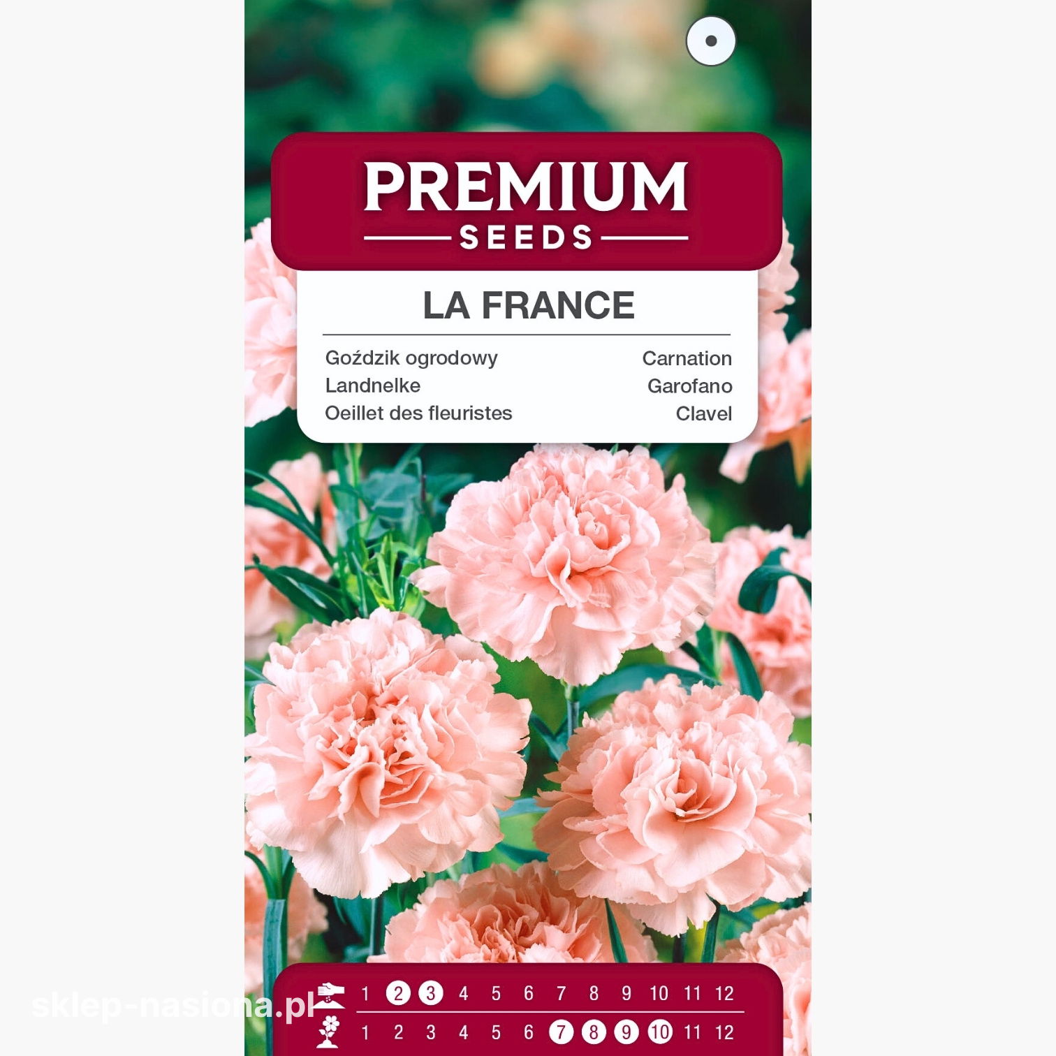 Goździk La France kwitnie od lipca do października, oferując długotrwałe i obfite kwitnienie w drugim roku uprawy. Roślina preferuje słoneczne miejsca, ale dobrze rośnie również w lekkim półcieniu.