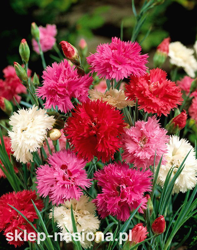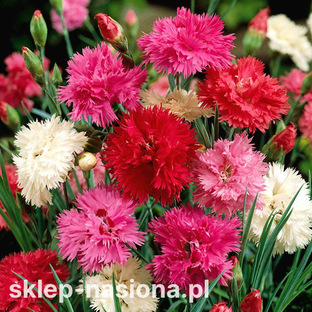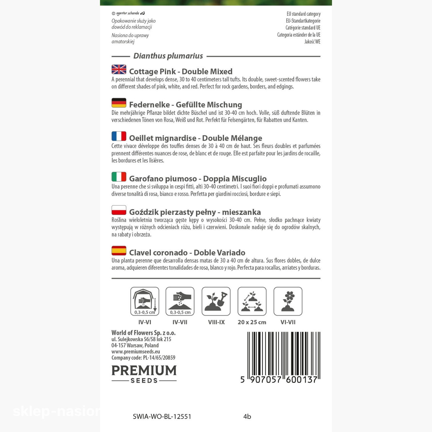 W każdej paczce znajduje się 0,3 g nasion goździka pierzastego pełnego - mieszanki. Opakowanie zawiera informacje o zasadach uprawy oraz o terminie przydatności do siewu.