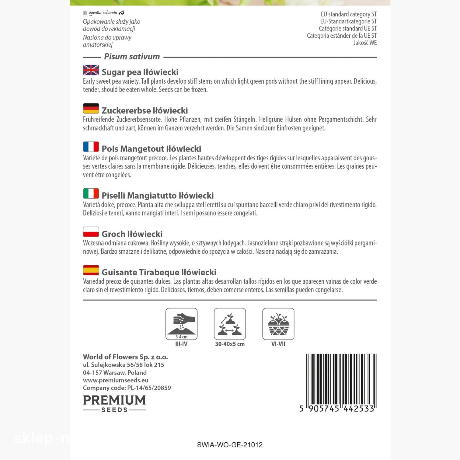 W paczce znajduje się 50 g nasion. Każde opakowanie zawiera ponadto informacje na temat terminu przydatności nasion do uprawy oraz wskazówki dotyczące siewu i pielęgnacji grochu cukrowego.