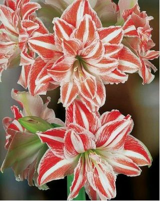 Rodzaj kwiatów: Hippeastrum zawdzięcza niezwykłą popularność swoim kwiatom. Każda roślina wytwarza od 4 do 6 kwiatów, które układają się w pierścień naokoło pędu. Każdy kwiat składa się z wielu płatków naprzemiennie ułożonych w okółki wokół licznych, wyraźnych pylników. Płatki są zróżnicowane pod względem wielkości i tworzą kilka pięter. Wszystkie mają lancetowaty kształt i są ostro zakończone.