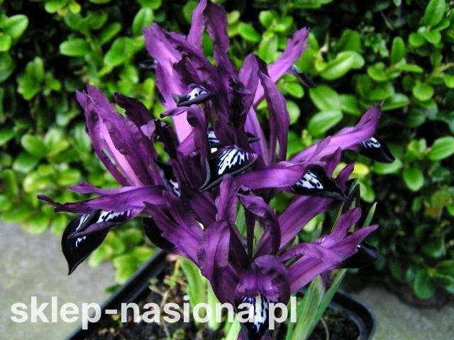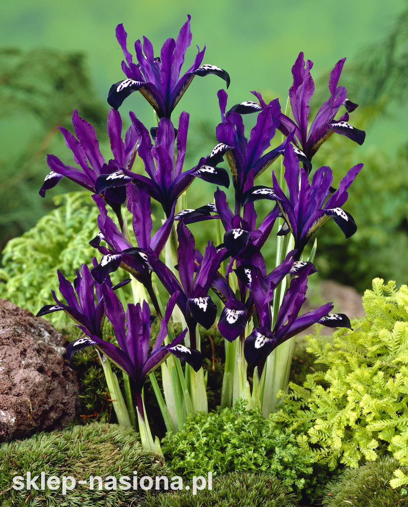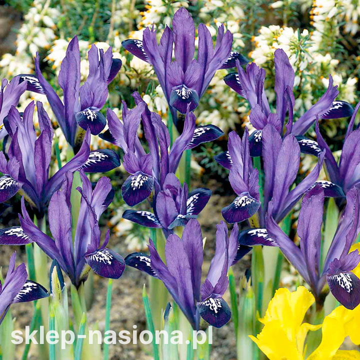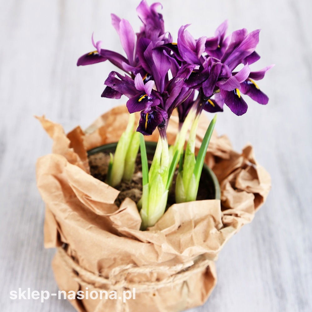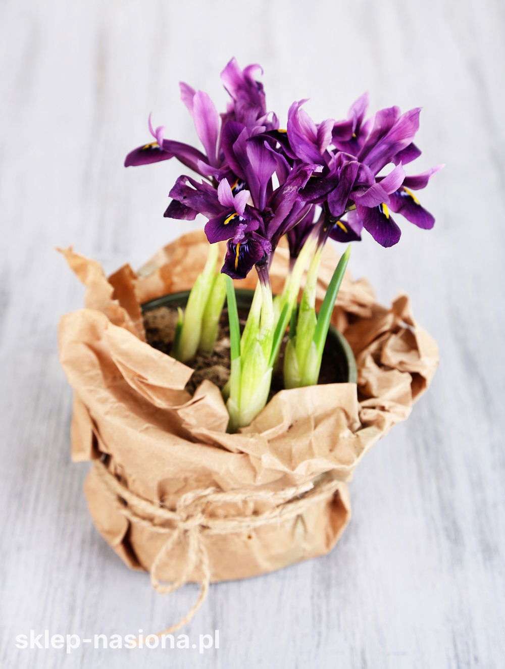 Opakowanie zawiera 10 sztuk irysa żyłkowanego Purple Gem o rozmiarze 6/7 cm wraz z informacjami odnośnie zasad uprawy.