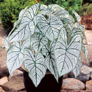 Zastosowanie: Kaladium to ciekawa roślina do uprawy w pojemnikach na okiennym parapecie. Odmiana Candidum o wyjątkowo dekoracyjnych liściach w białym kolorze, które zdobi ciemnozielone unerwienie. Jest to wyjątkowa roślina do dekoracji wnętrz, pięknie wygląda sadzona pojedynczo lub jako część różnogatunkowej kompozycji.