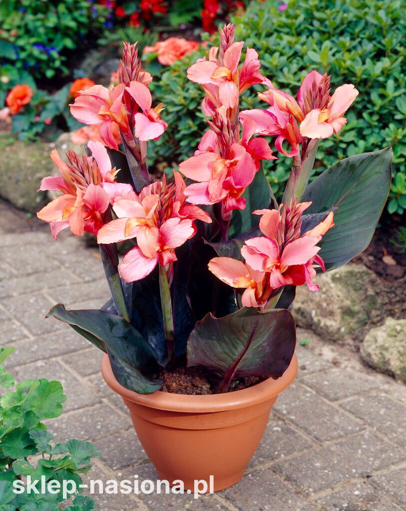 Kolor kwiatów: różowo-morelowe kwiaty kanny Champion zachwycają egotycznym czarem.
