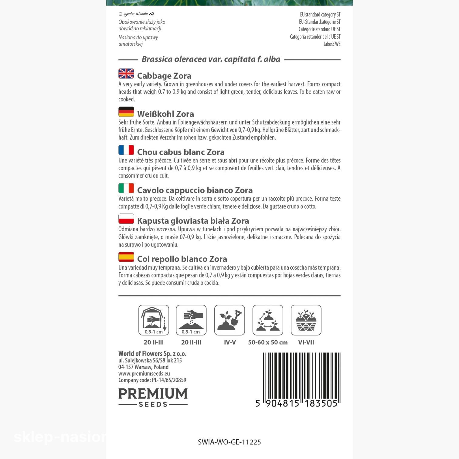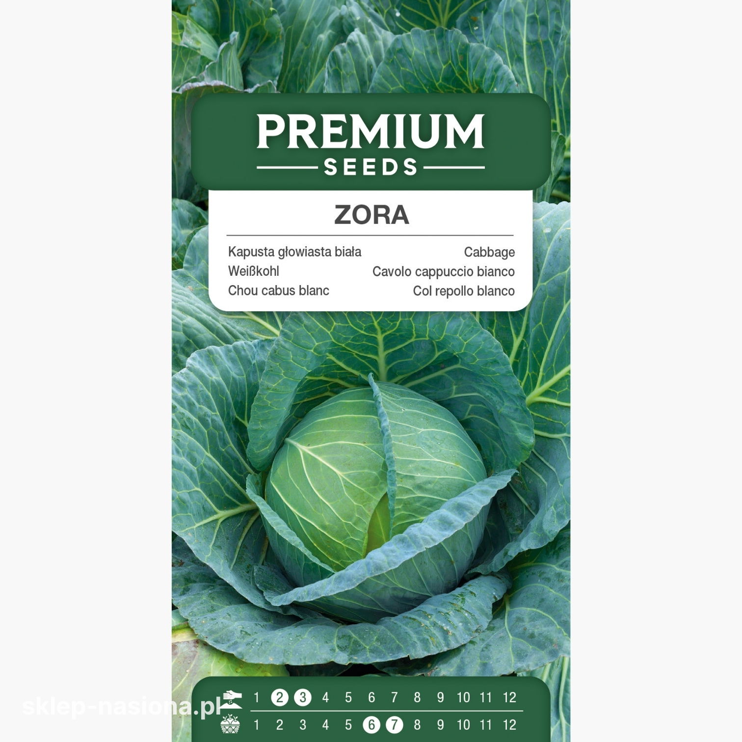 Kapusta głowiasta biała Zora to jedna z najwcześniejszych odmian, zbiór główek jest możliwy już po 60 dniach od wysadzenia rozsady do gruntu. Jest to odmiana w typie kapusty Pierwszy Zbiór. Polecana jest do uprawy w tunelach foliowych i pod przykryciem oraz do uprawy w gruncie na najwcześniejszy zbiór. Rośliny niskie o krótkim głąbie, które nie wykazują tendencji do wybijania w pędy nasienne.
