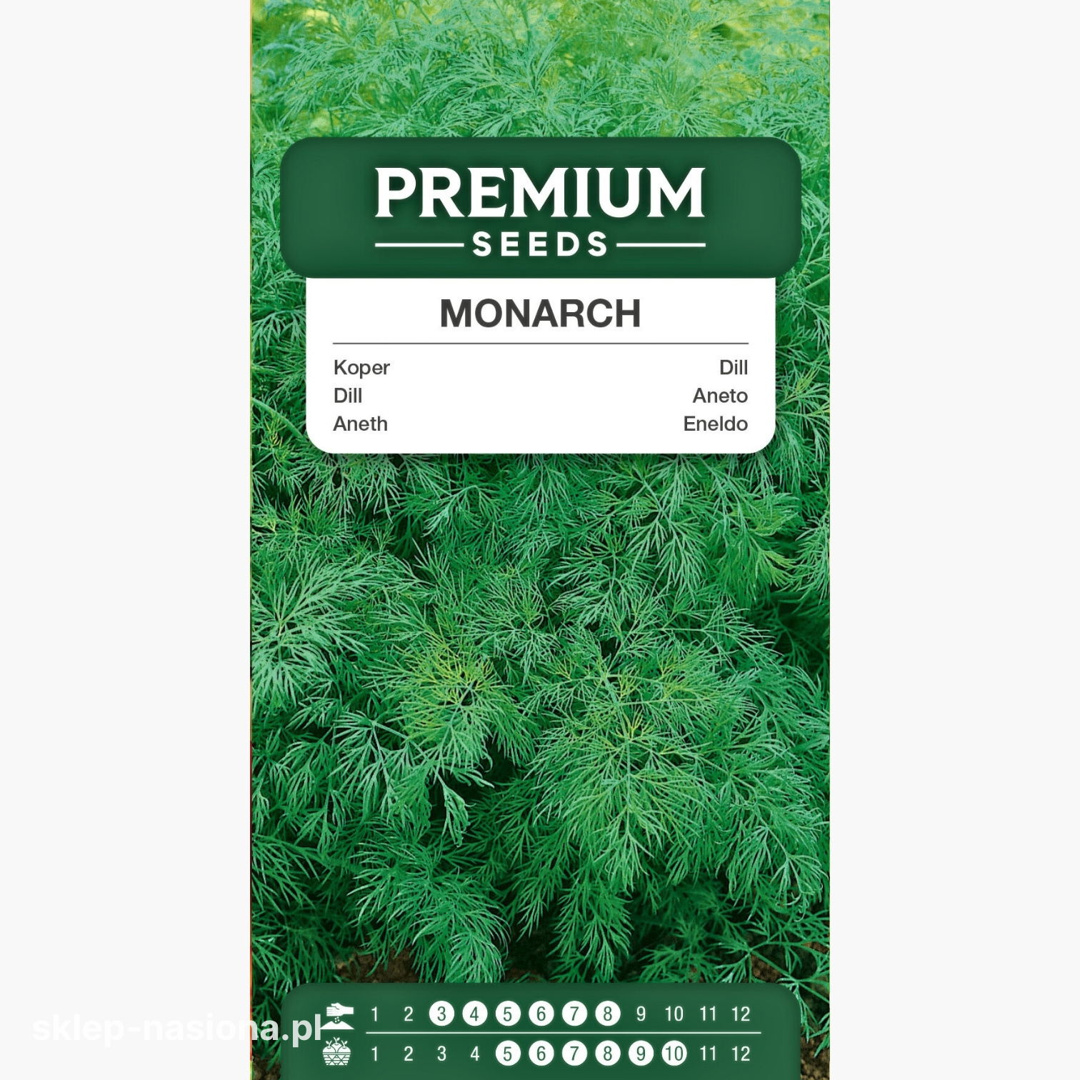 Opakowanie zawiera 3 gram nasion kopru ogrodowego Monarch, informacje o uprawie oraz termin przydatności do siewu.