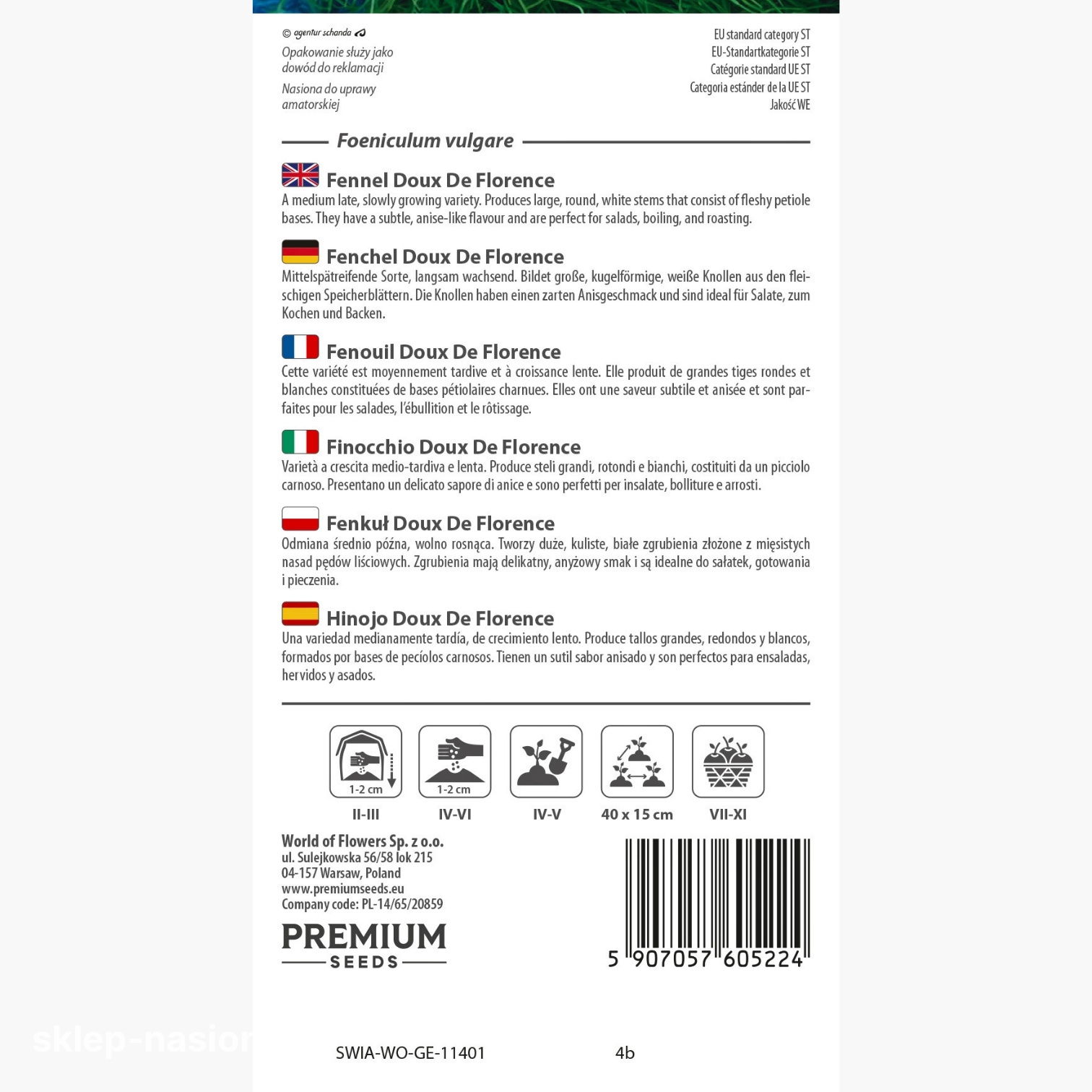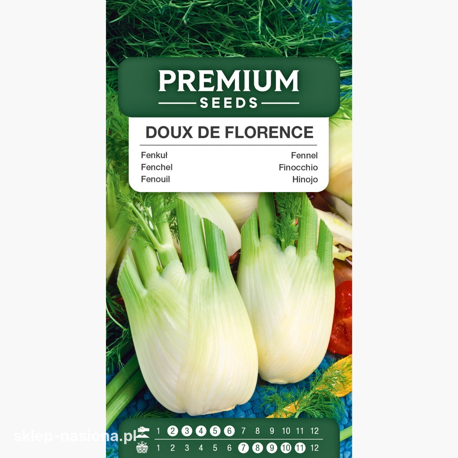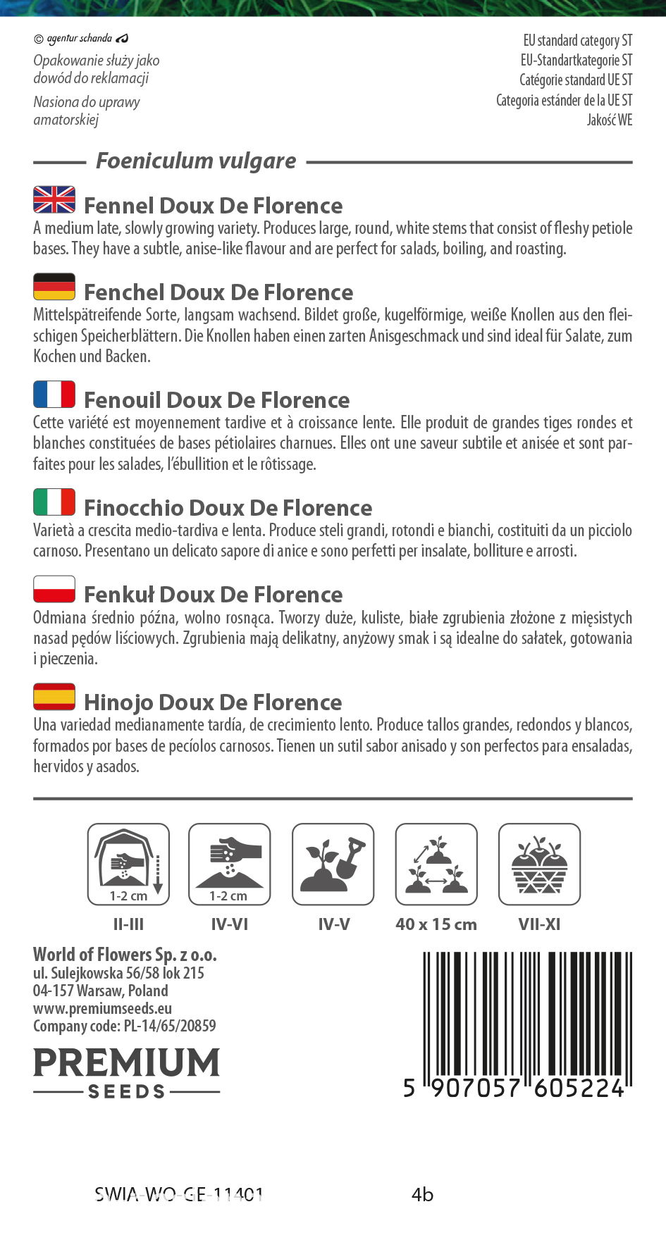 W opakowaniu znajduje się 5 g nasion kopru włoskiego Doux de Florence. Na odwrocie opakowania umieszczono instrukcję wysiewu oraz termin przydatności nasion do siewu.