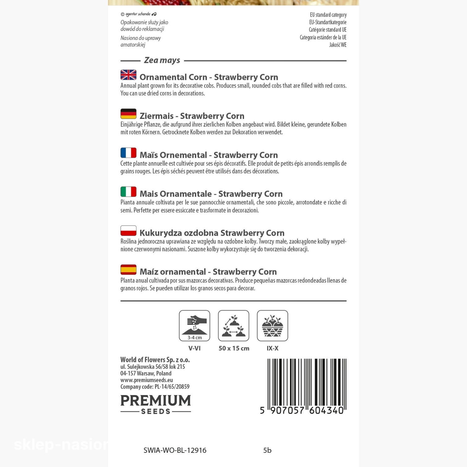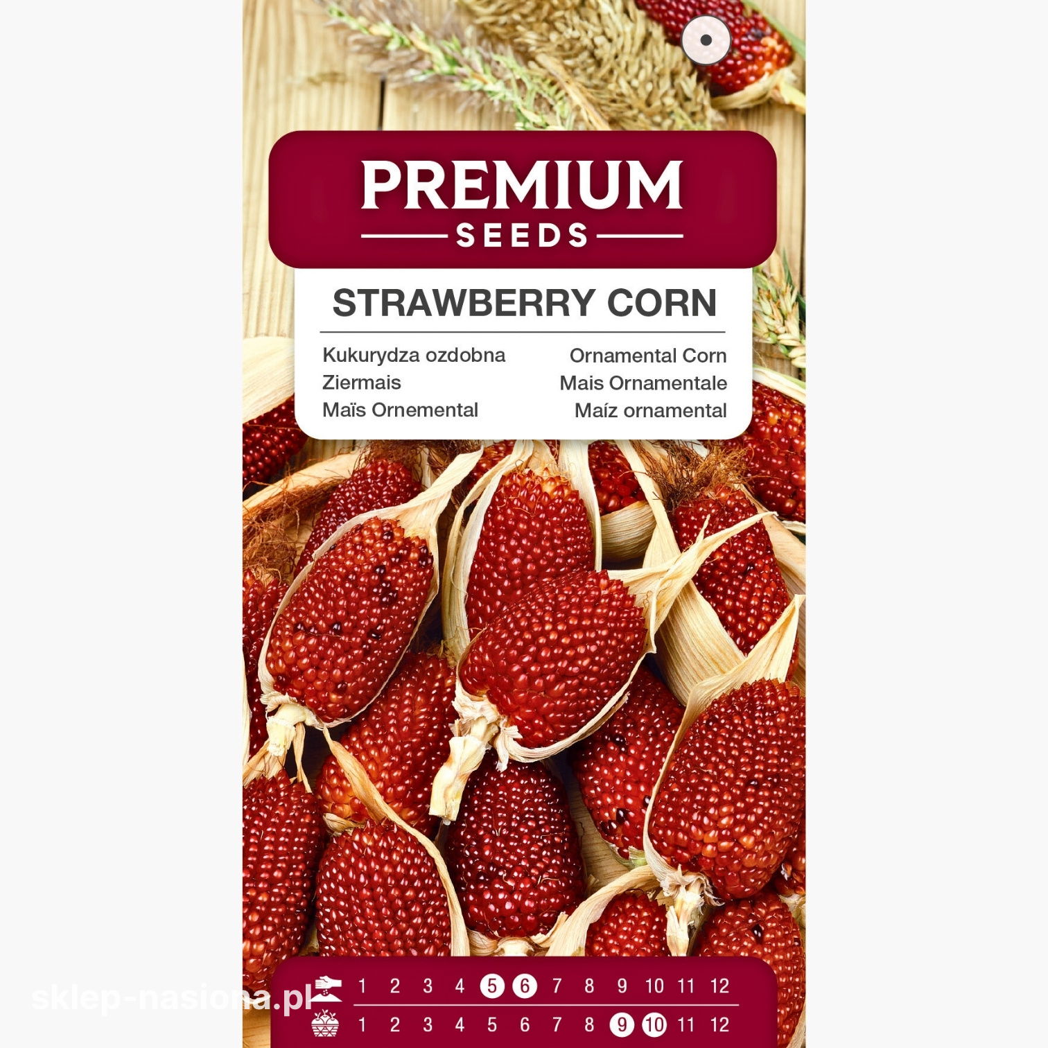 W opakowaniu znajdują się 3 g wysokiej jakości nasion kukurydzy ozdobnej truskawkowej. Na tyle paczki zamieszczono informacje na temat uprawy i pielęgnacji rośliny oraz termin przydatności nasion do siewu.