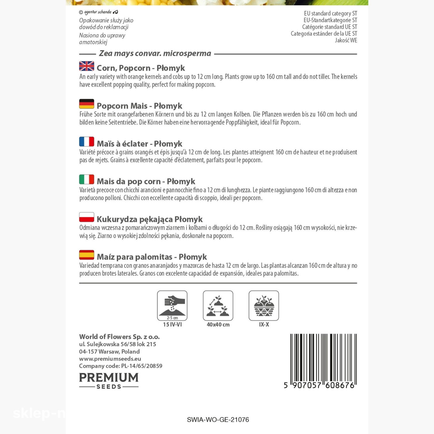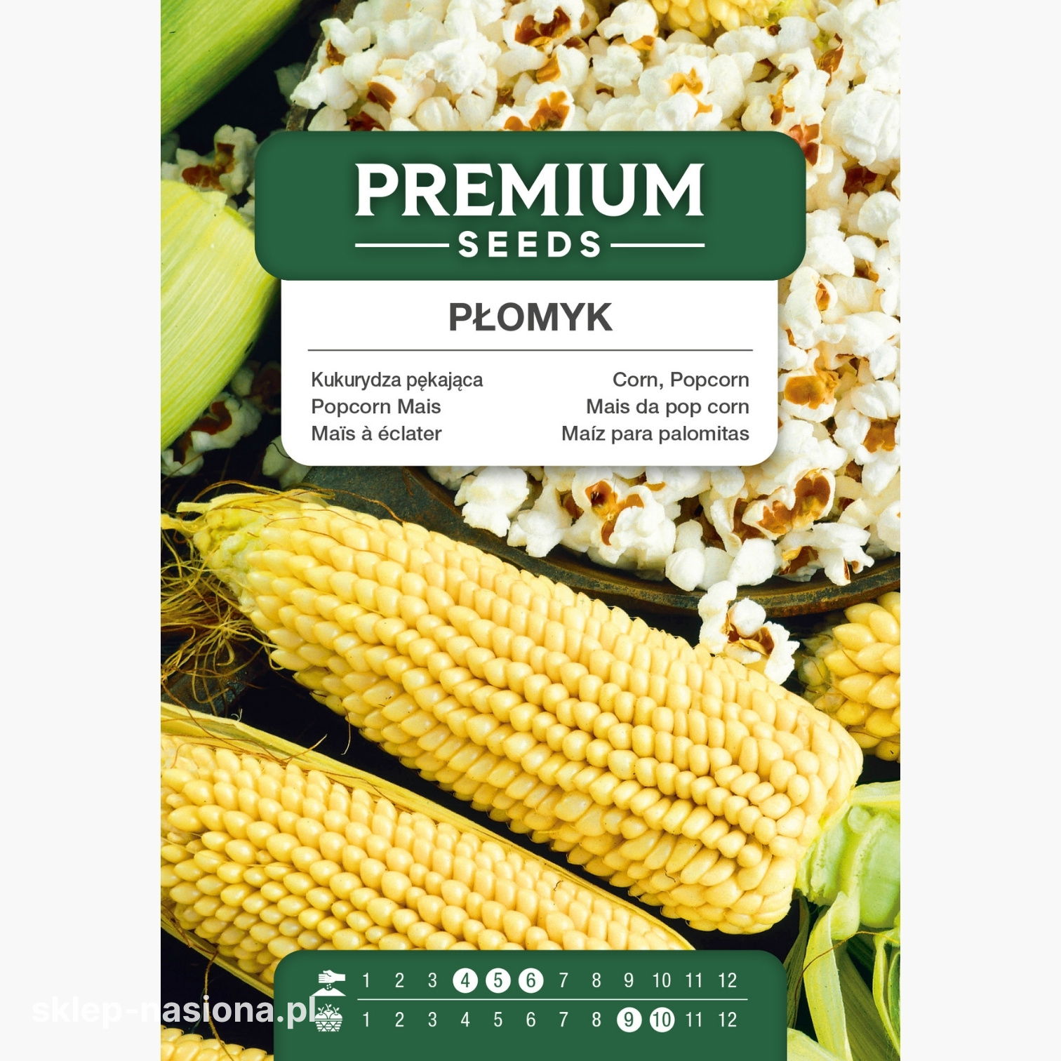 W każdym opakowaniu znajdziesz 20 g kukurydzy pękającej Płomyk, a na odwrocie instrukcję jej uprawy oraz termin przydatności do wysiewu.