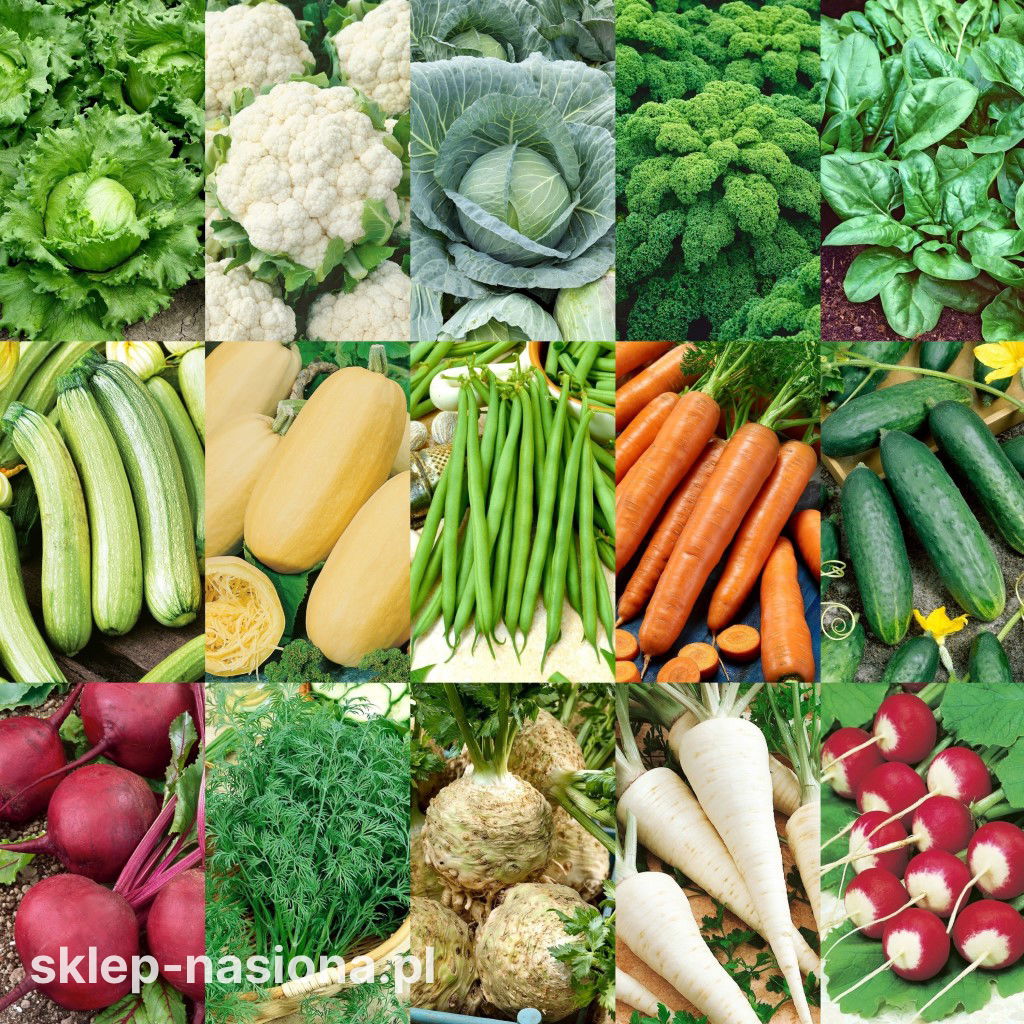 Zawartość zestawu: Burak ćwikłowy Jawor, Cukinia Bianca di Trieste, Dynia makaronowa Warszawska, Fasola Delfina, Jarmuż Halbhoher gruner krauser, Kalafior Snowball X, Kapusta głowiasta biała Zora, Koper ogrodowy Krezus, Marchew Karotina, Ogórek Delicious, Pietruszka Cukrowa, Rzodkiewka Tetra Iłówiecka, Sałata Traper, Seler korzeniowy Talar, Szpinak Matador.