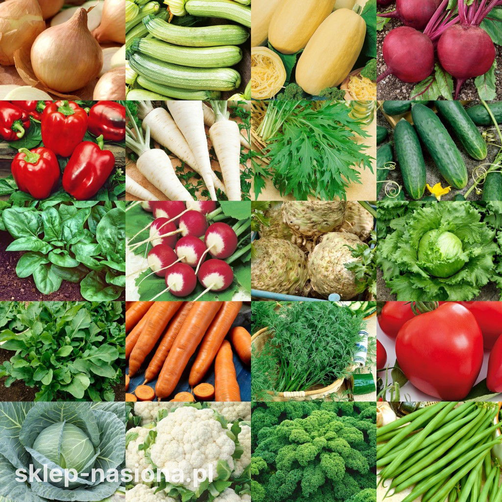 Zawartość zestawu: Burak ćwikłowy Jawor, Cebula Globo, Cukinia Bianca di Trieste, Dynia makaronowa Warszawska, Fasola Delfina, Jarmuż Halbhoher gruner krauser, Kalafior Snowball X, Kapusta głowiasta biała Zora, Koper ogrodowy Krezus, Marchew Karotina, Mizuna zielona, Ogórek Delicious, Papryka California Wonder, Pietruszka Cukrowa, Pomidor Herodes, Rukola Rokietta siewna, Rzodkiewka Tetra Iłówiecka, Sałata Traper, Seler korzeniowy Talar, Szpinak Matador.