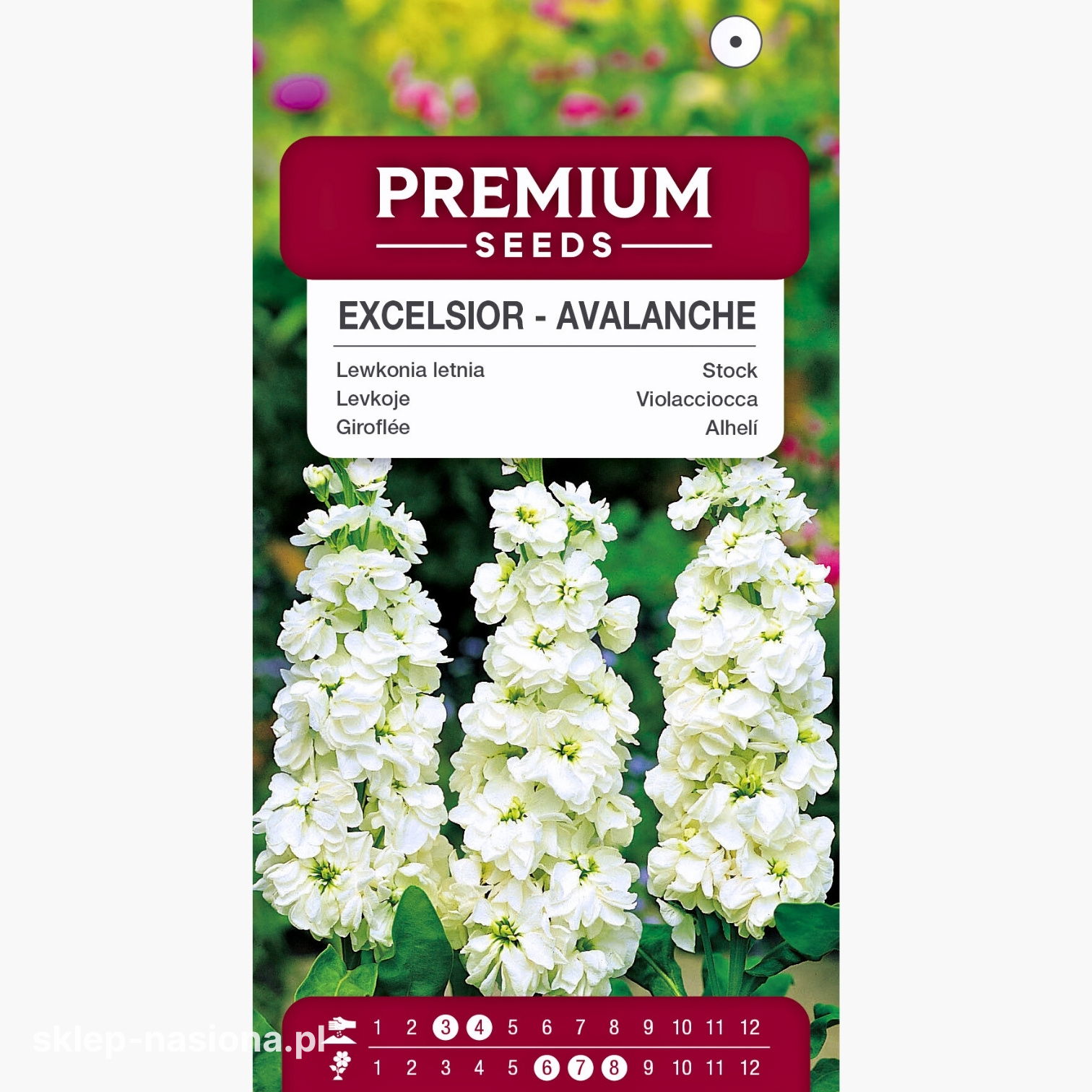 Opakowanie zawiera 0,5 g nasion lewkonii letniej Excelsior o kwiatach w białym kolorze, informacje dotyczące sposobu uprawy oraz termin przydatności do wysiewu.