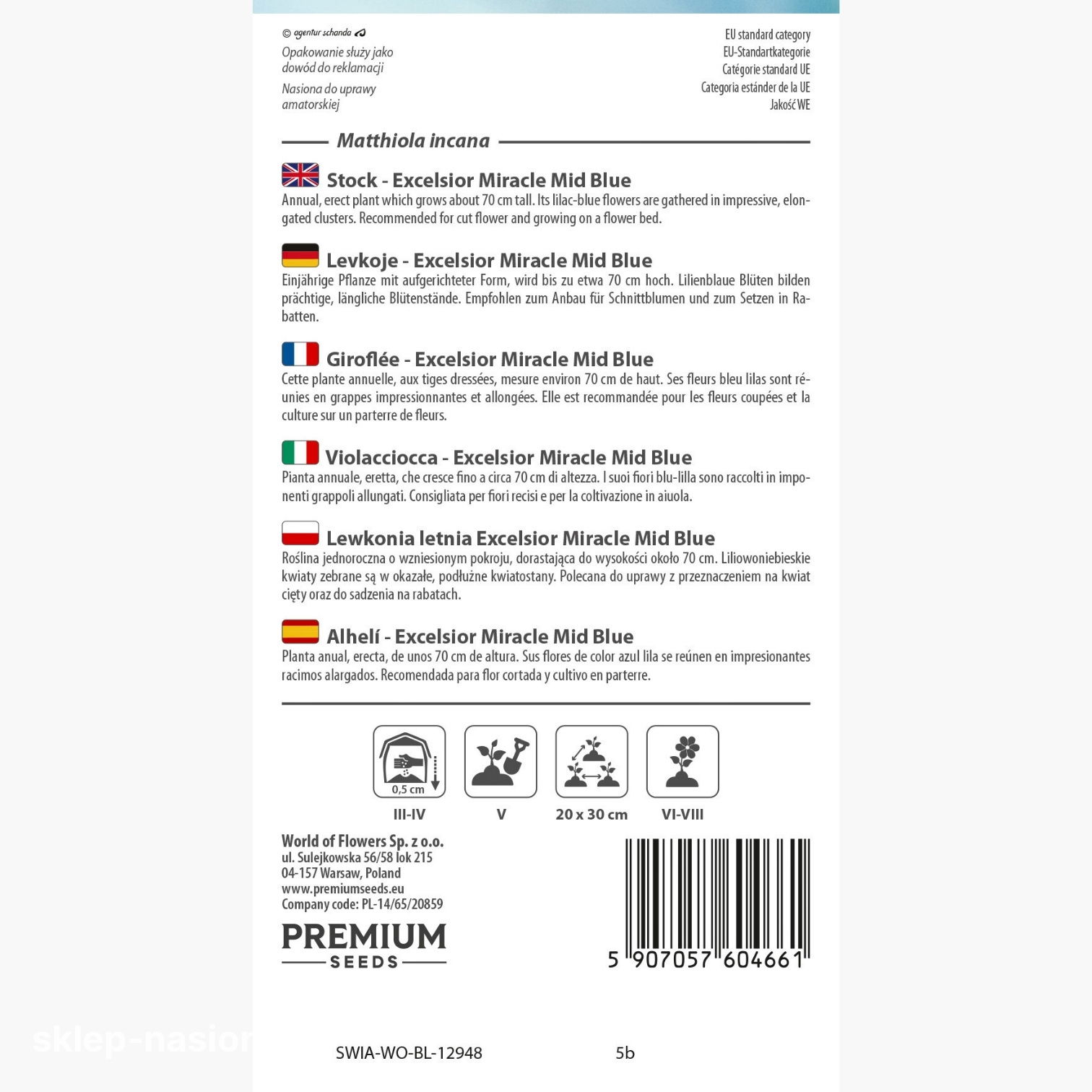 Oferujemy sprzedaż nasion lewkonii letniej Excelsior w paczkach o gramaturze 0,5 g. Na opakowaniu zamieszczono również wskazówki dotyczące uprawy roślin i informacje na temat okresu przydatności ich nasion do siewu.