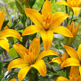 Lilia azjatycka 'Gold Twin' to niezwykła odmiana, która przyciąga uwagę swoimi jaskrawo żółtymi, podwójnymi kwiatami, dodającymi ciepła i uroku każdej przestrzeni. Dzięki obfitości kwitnienia i imponującej wysokości, jest wspaniałym wyborem do ogrodu, oferującym długotrwałą, kolorową ozdobę. Regularne podlewanie i odpowiednie stanowisko zapewnią jej obfite kwitnienie, co czyni 'Gold Twin' atrakcyjną zarówno wizualnie, jak i pod względem łatwości uprawy.