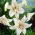 Rodzaj kwiatów: Duże, miseczkowate kwiaty White Tiger mają płatki szeroko rozchylone i lekko wygięte do tyłu. W ich środkowej części dobrze widać brązowe plamki, pasujące barwą do pręcików.