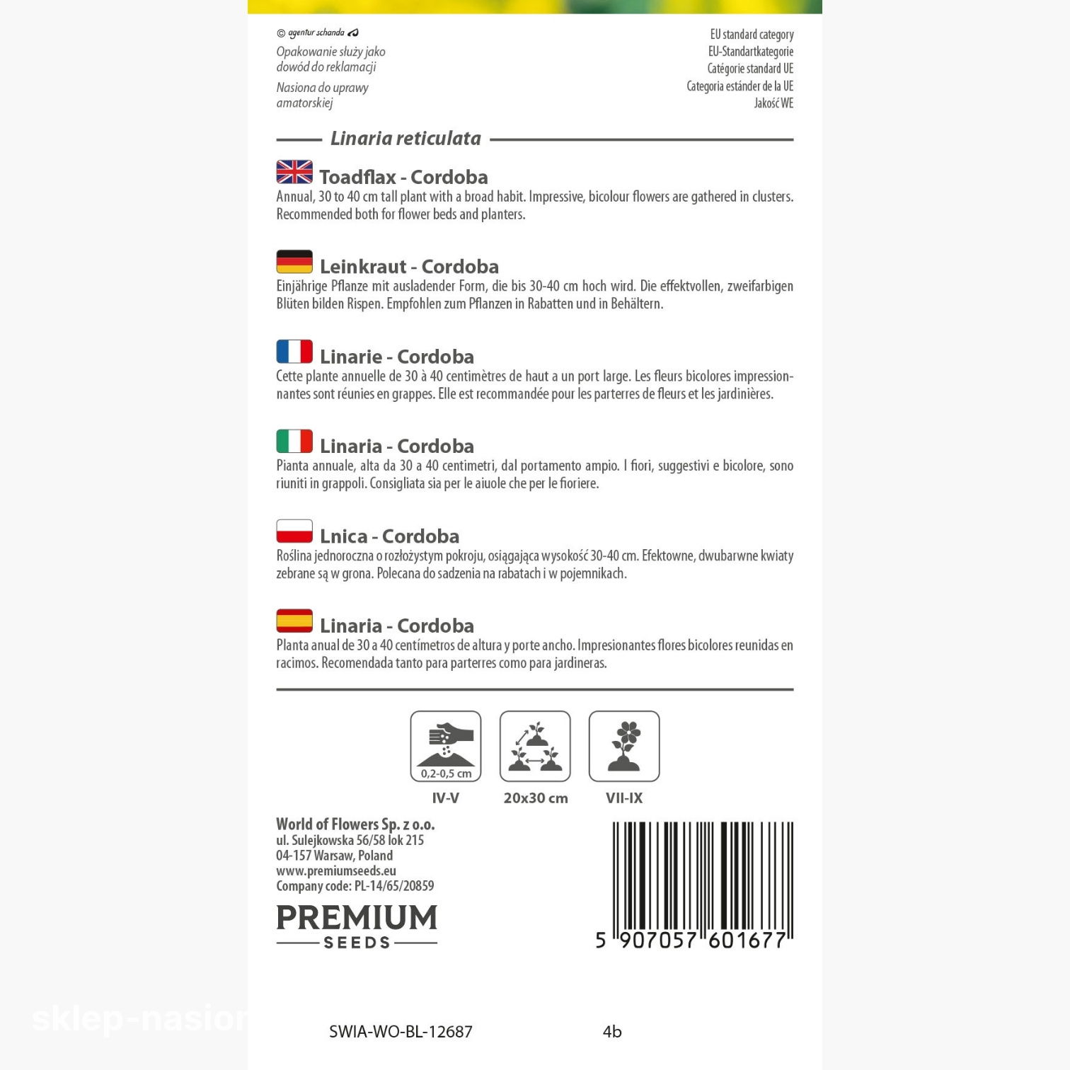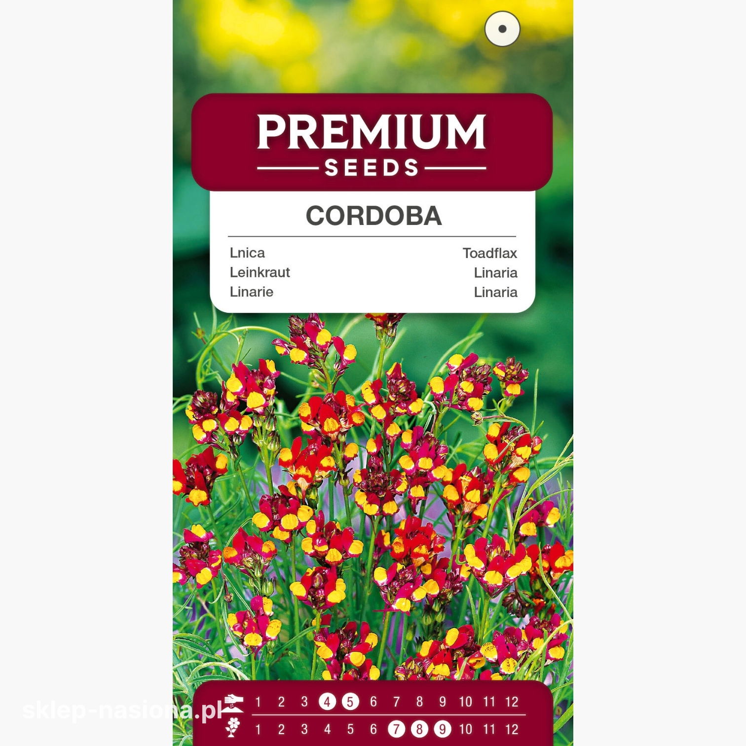 W opakowaniu znajduje się 0,5 g nasion Lnicy Cordoba. Każda paczka zawiera szczegółowe informacje o terminie przydatności do siewu i praktyczne wskazówki dotyczące uprawy.