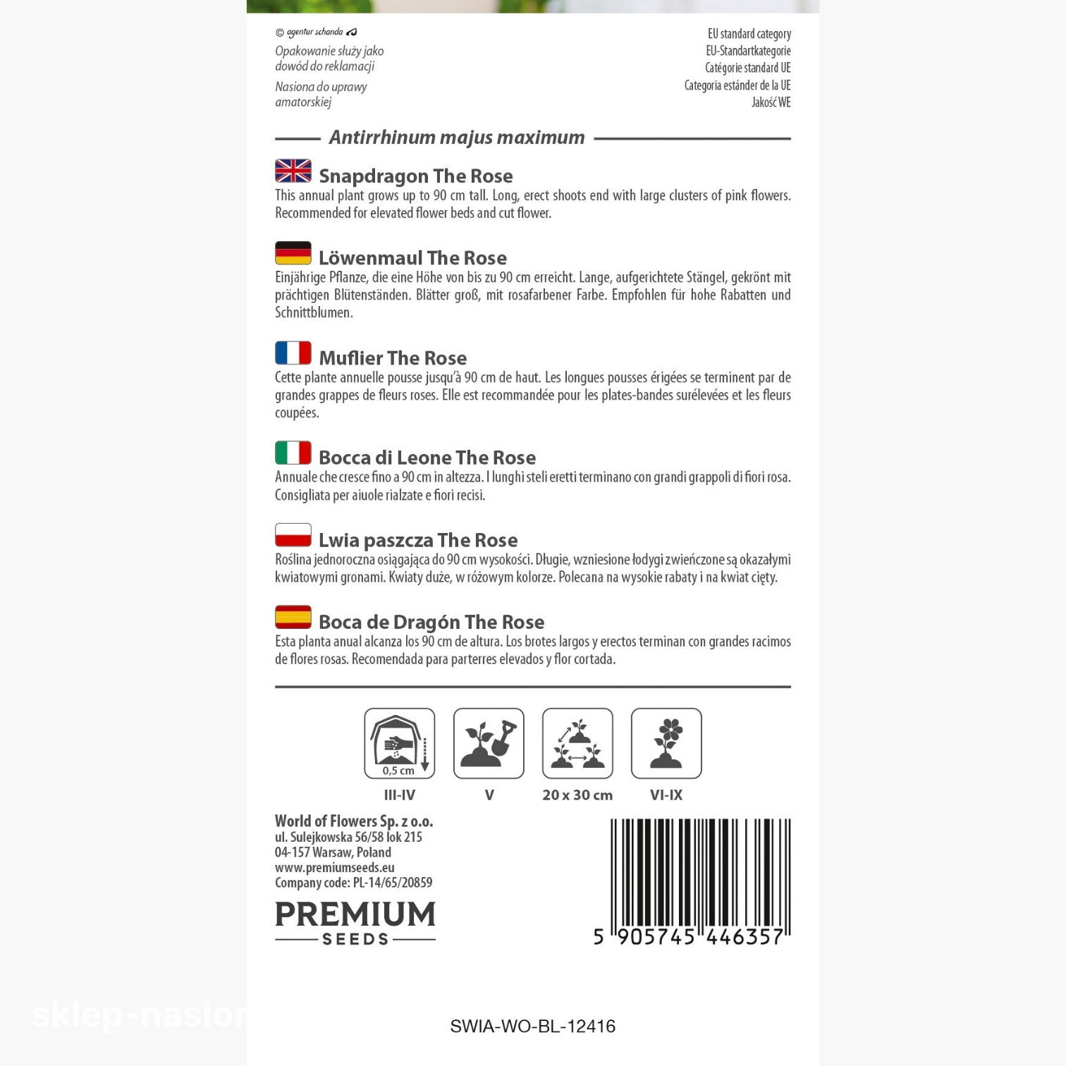 Opakowanie zawiera 0,5 g nasion lwiej paszczy wysokiej o kwiatach różowych, informacje na temat daty przydatności nasion do siewu i zasady uprawy.