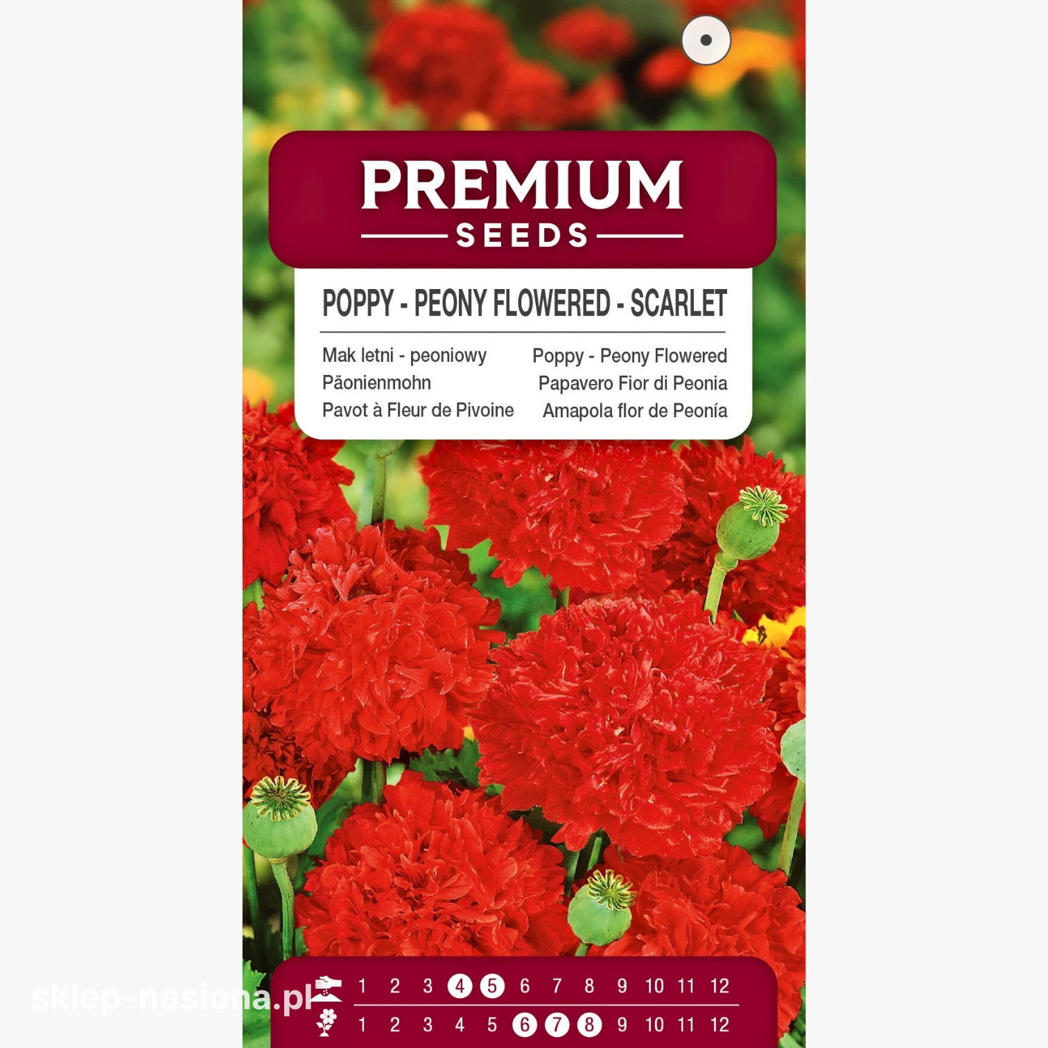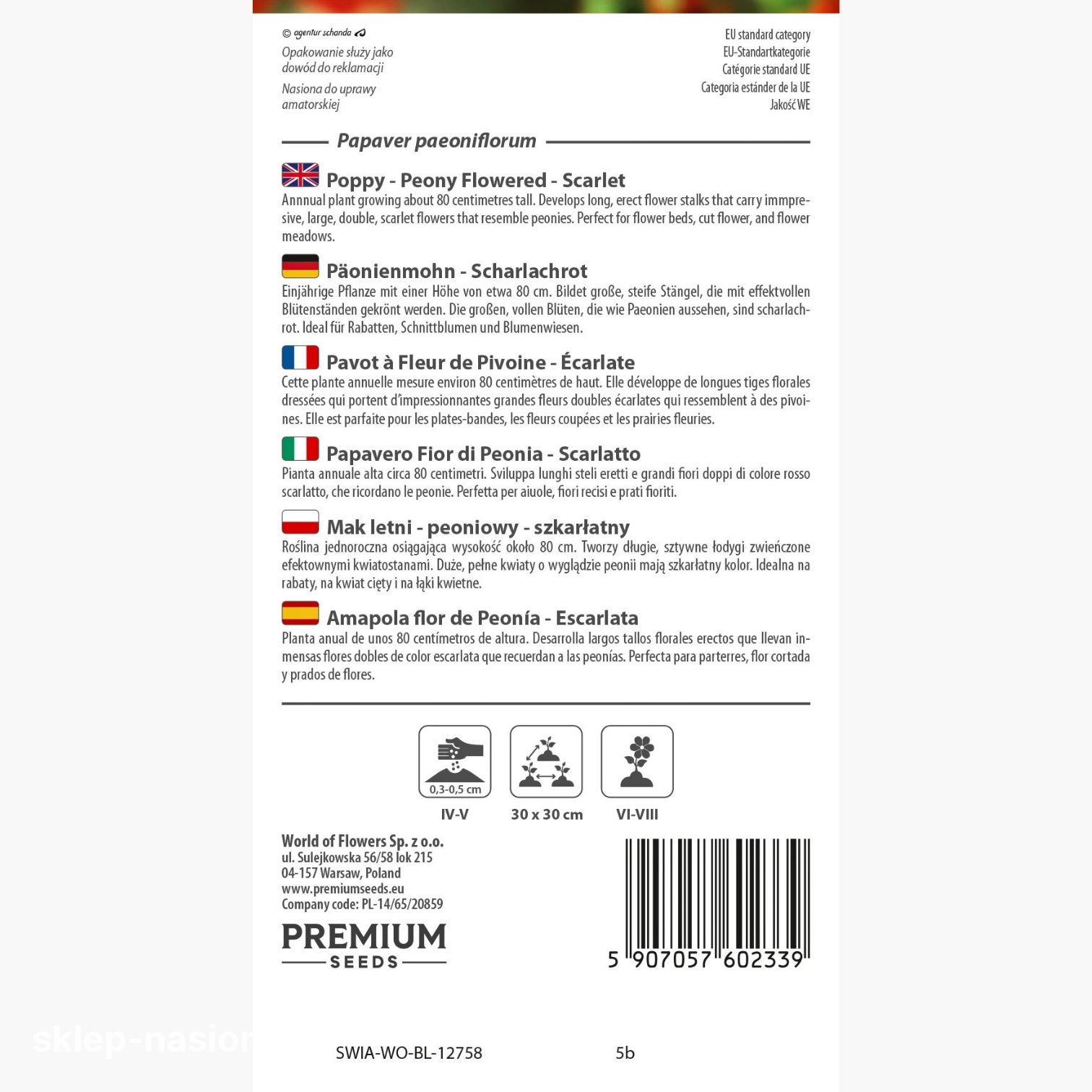 W opakowaniu znajduje się 0,5 g nasion maku letniego peoniowego szkarłatnego. Każde opakowanie posiada datę przydatności do siewu oraz praktyczne wskazówki dotyczące uprawy.